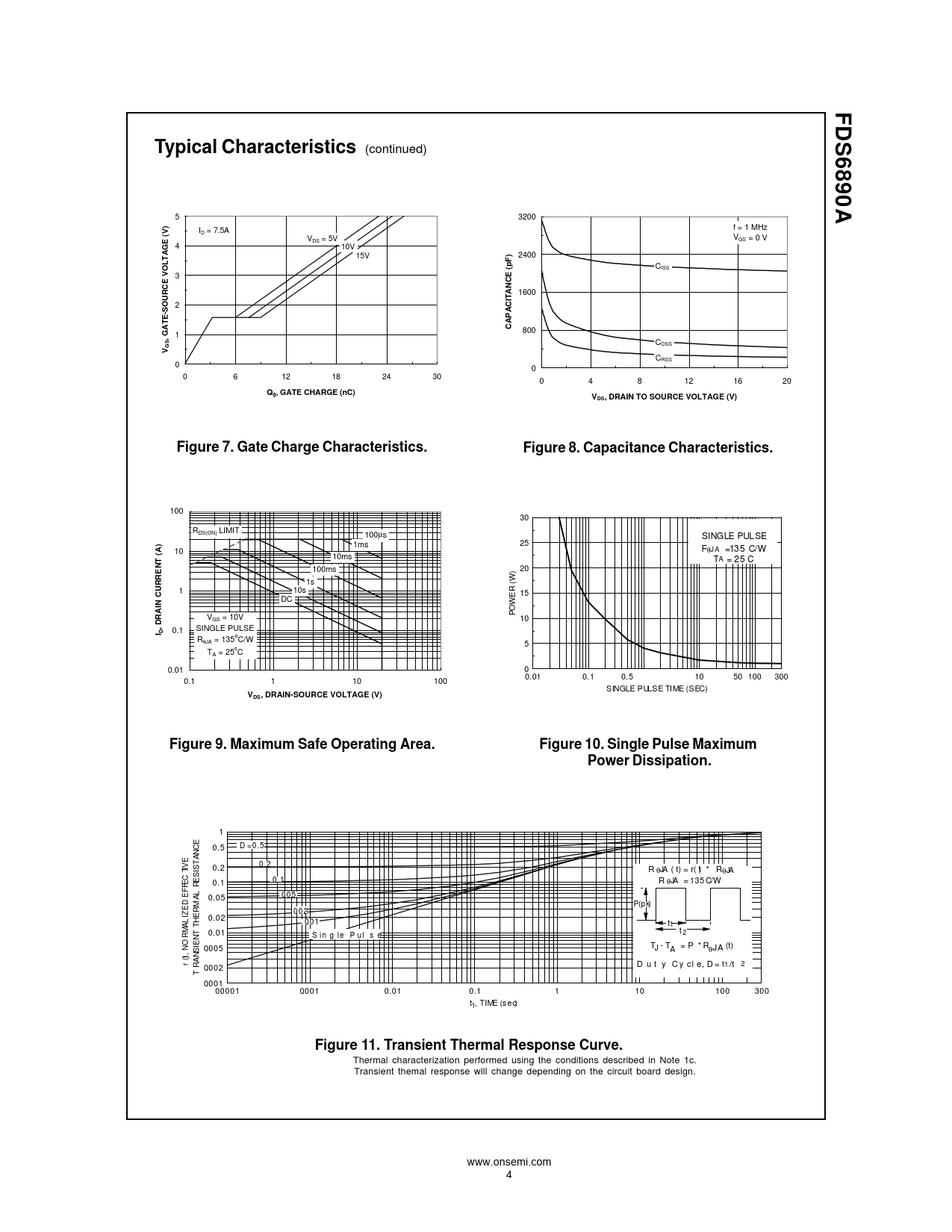 FDS6890ATypical Characteristics (continued) 5 3200 ) f = 1 MHz ID = 7.5A (V V VGS = 0 V E DS = 5V 4 10V AG 15V ) 2400 TFLpO( CISS V 3 EANC 1600 URCE O 2 CIT A-SPE ATCA 800 1 , G COSS GSV CRSS 0 0 0 6 12 18 24 30 0 4 8 12 16 20 Qg, GATE CHARGE (nC)VDS, DRAIN TO SOURCE VOLTAGE (V)Figure 7. Gate Charge Characteristics.Figure 8. Capacitance Characteristics. 100 30 RDS(ON) LIMIT 100µs SINGLE PUL SE ) 1ms 25 A R 10 θ J A =13 5 C/W ( 10ms T A = 2 5 C NT 100ms 20 ) W 1s ( URRE R 1 10s E 15 DC W AIN C PO VGS = 10V 10 , DR 0.1 SINGLE PULSE I D RθJA = 135oC/W 5 TA = 25oC 0.01 0 0. 01 0. 1 0. 5 10 50 100 300 0.1 1 10 100 SINGLE PULSE TI ME (SEC) VDS, DRAIN-SOURCE VOLTAGE (V)Figure 9. Maximum Safe Operating Area.Figure 10. Single Pulse MaximumPower Dissipation. 1 0.5 D = 0 .5 NCE A E T 0.2 0 .2 TIV IS R θ JA ( t ) = r( t) * R θJA S 0.1 0 .1 R θ JA = 135 C/W FEC RE F L E A 0.05 0.0 5 D P(p k) E RM 0.0 2 IZ 0.02 L HE A 0.0 1 t T 1 M 0.01 t R 2 NT S i n g l e P u l s e O IE 0.005 T - T = P * R (t) J A θJA ), N NS r (t RA D u t y C y c l e, D = t 1 /t 2 0.002 T 0.001 0.0001 0.001 0.01 0.1 1 10 100 300 t , TIME (s ec) 1 Figure 11. Transient Thermal Response Curve. Thermal characterization performed using the conditions described in Note 1c. Transient themal response will change depending on the circuit board design. www.onsemi.com 4