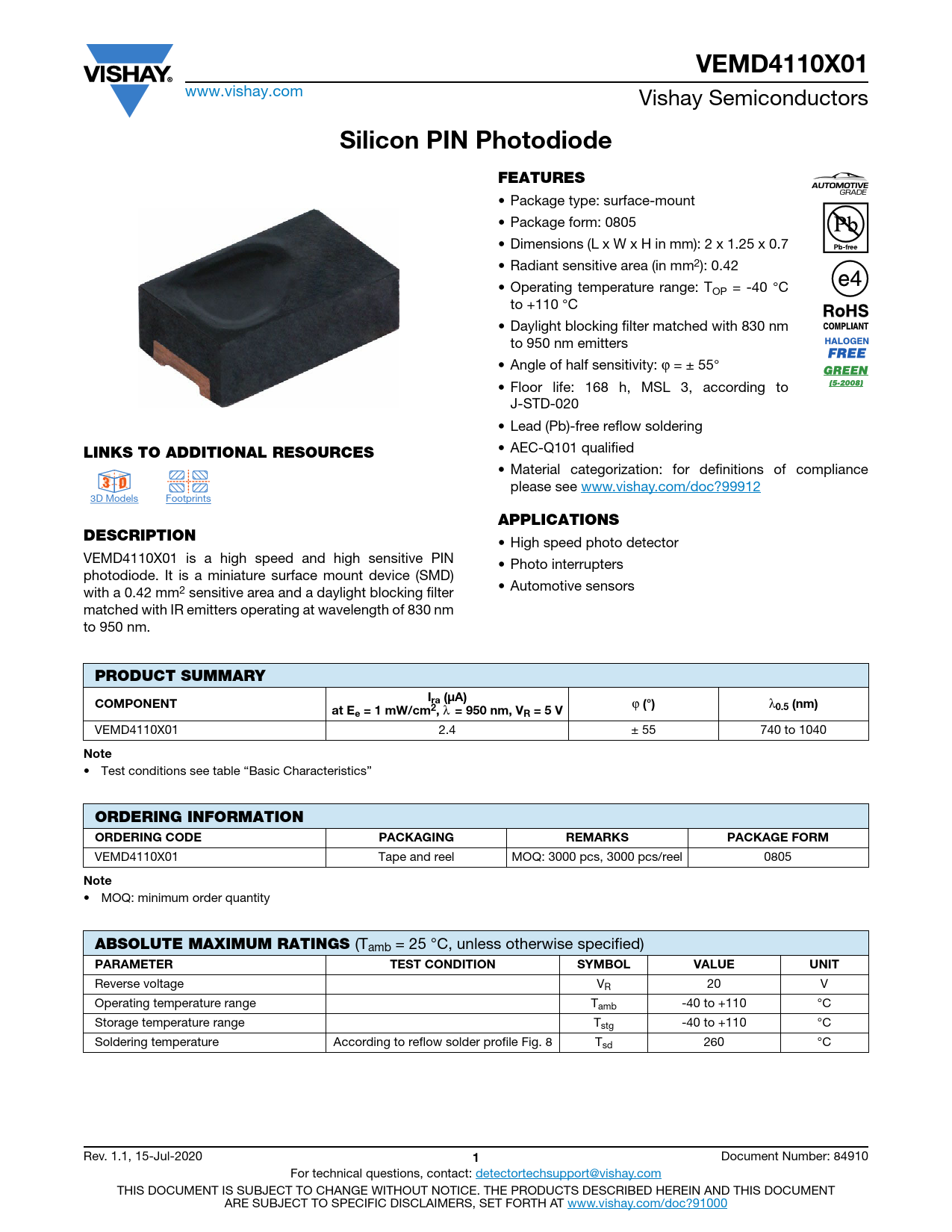 Datasheet VEMD4110X01 Vishay