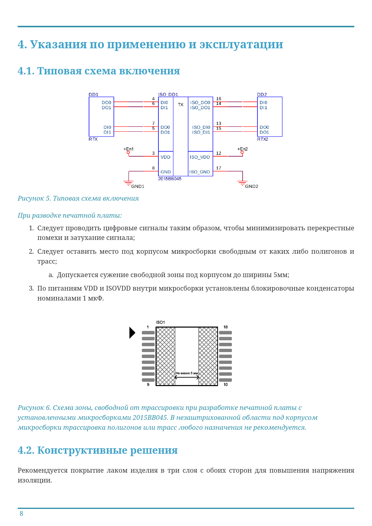 Рисунок 5. Типовая схема включения При разводке печатной платы: 1. Следует проводить цифровые сигналы таким образом, чтобы минимизировать перекрестные помехи и затухание сигнала; 2. Следует оставить место под корпусом микросборки свободным от каких либо полигонов и трасс; a. Допускается сужение свободной зоны под корпусом до ширины 5мм; 3. По питаниям VDD и ISOVDD внутри микросборки установлены блокировочные конденсаторы номиналами 1 мкФ. Рисунок 6. Схема зоны, свободной от трассировки при разработке печатной платы с установленными микросборками 2015ВВ045. В незаштрихованной области под корпусом микросборки трассировка полигонов или трасс любого назначения не рекомендуется.