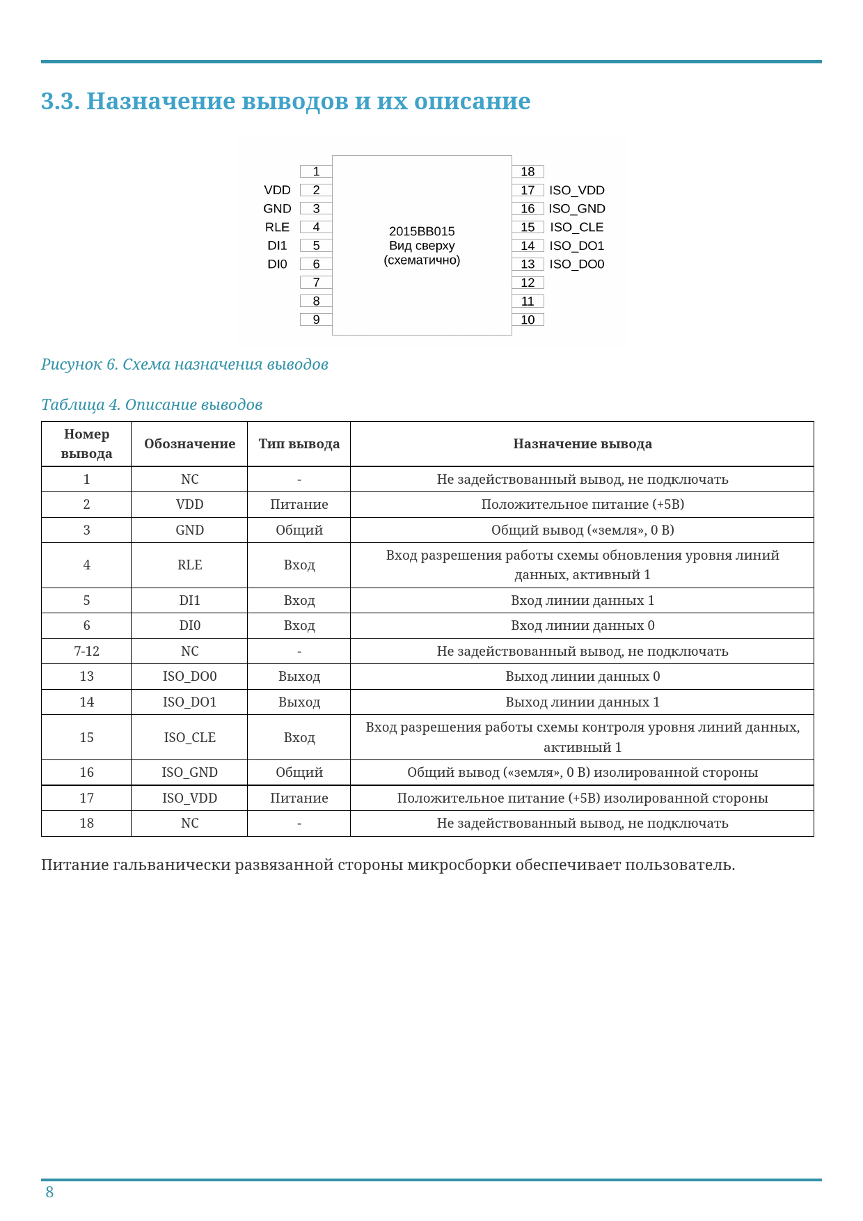 3.3. Назначение выводов и их описание Рисунок 6. Схема назначения выводов Таблица 4. Описание выводов НомерОбозначениеТип выводаНазначение выводавывода 1 NC - Не задействованный вывод, не подключать 2 VDD Питание Положительное питание (+5В) 3 GND Общий Общий вывод («земля», 0 В) Вход разрешения работы схемы обновления уровня линий 4 RLE Вход данных, активный 1 5 DI1 Вход Вход линии данных 1 6 DI0 Вход Вход линии данных 0 7-12 NC - Не задействованный вывод, не подключать 13 ISO_DO0 Выход Выход линии данных 0 14 ISO_DO1 Выход Выход линии данных 1 Вход разрешения работы схемы контроля уровня линий данных, 15 ISO_CLE Вход активный 1 16 ISO_GND Общий Общий вывод («земля», 0 В) изолированной стороны 17 ISO_VDD Питание Положительное питание (+5В) изолированной стороны 18 NC - Не задействованный вывод, не подключать Питание гальванически развязанной стороны микросборки обеспечивает пользователь. 8 Document Outline Микросборка двухканальная гальванической развязки цифровых сигналов 2015ВВ015 : 1.9 Оглавление 1. Общие положения 1.1. Функциональное назначение 1.2. Область применения 1.3. Технические условия 2. Описание работы 3. Основные параметры 3.1. Рабочий диапазон 3.2. Электрические параметры 3.3. Назначение выводов и их описание 3.4. Конструктивное исполнение 4. Указания по применению и эксплуатации 4.1. Типовая схема включения 4.2. Конструктивные решения 5. Справочная информация 5.1. Условное графическое обозначение 5.2. Осциллограммы работы микросборки 5.3. Отладочная плата 6. Обратная связь 7. Лист изменений