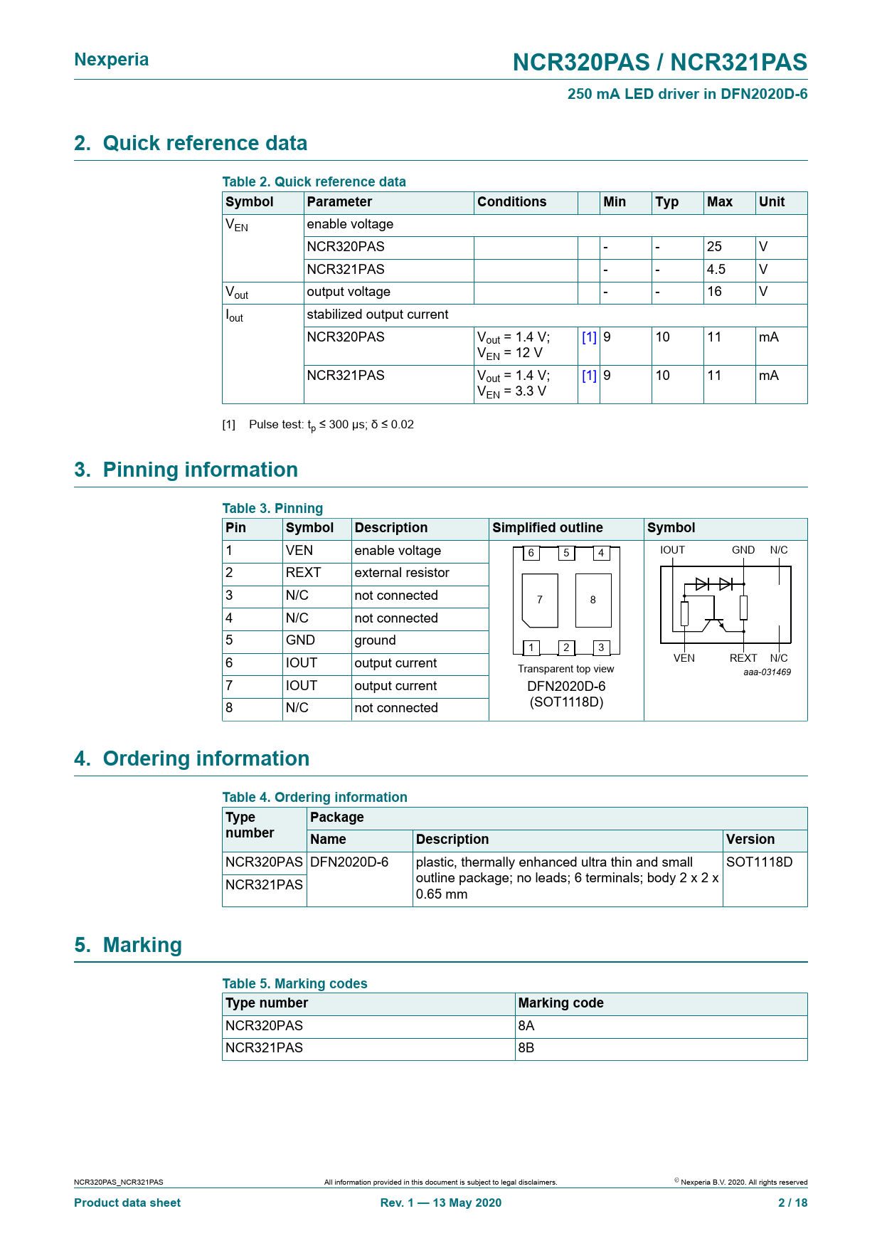 Nexperia. NCR320PAS / NCR321PAS. 250 mA LED driver in DFN2020D-6. 2. Quick reference data. Table 2. Quick reference data. Symbol