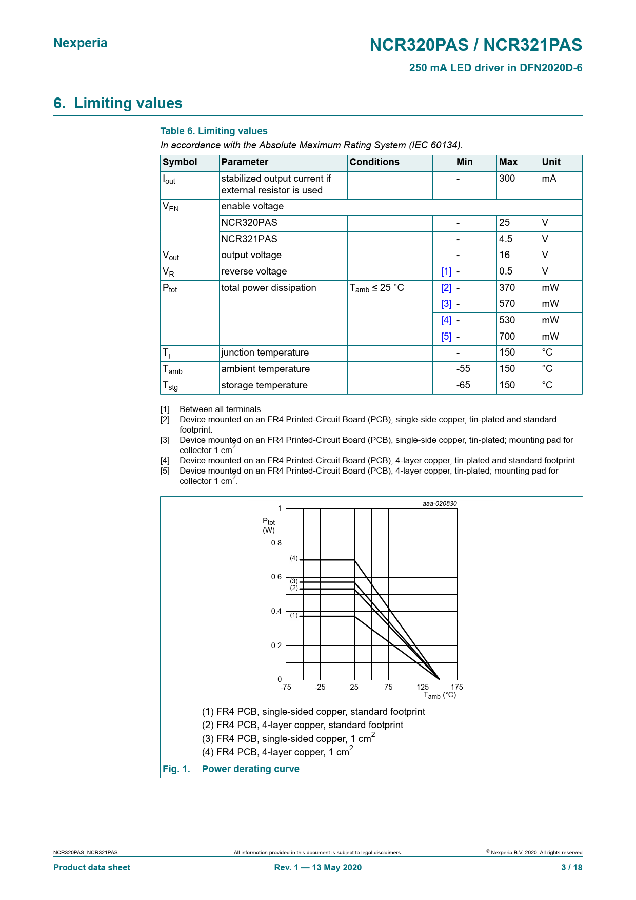 Nexperia NCR320PAS / NCR321PAS 250 mA LED driver in DFN2020D-6 6. Limiting values Table 6. Limiting values