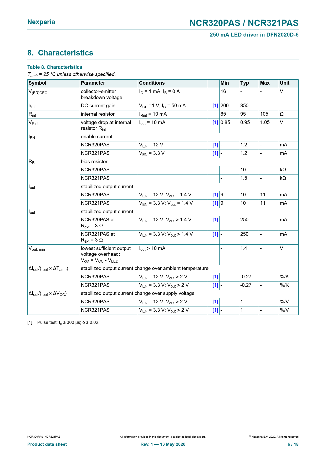 Nexperia. NCR320PAS / NCR321PAS. 250 mA LED driver in DFN2020D-6. 8. Characteristics Table 8. Characteristics. Symbol. Parameter
