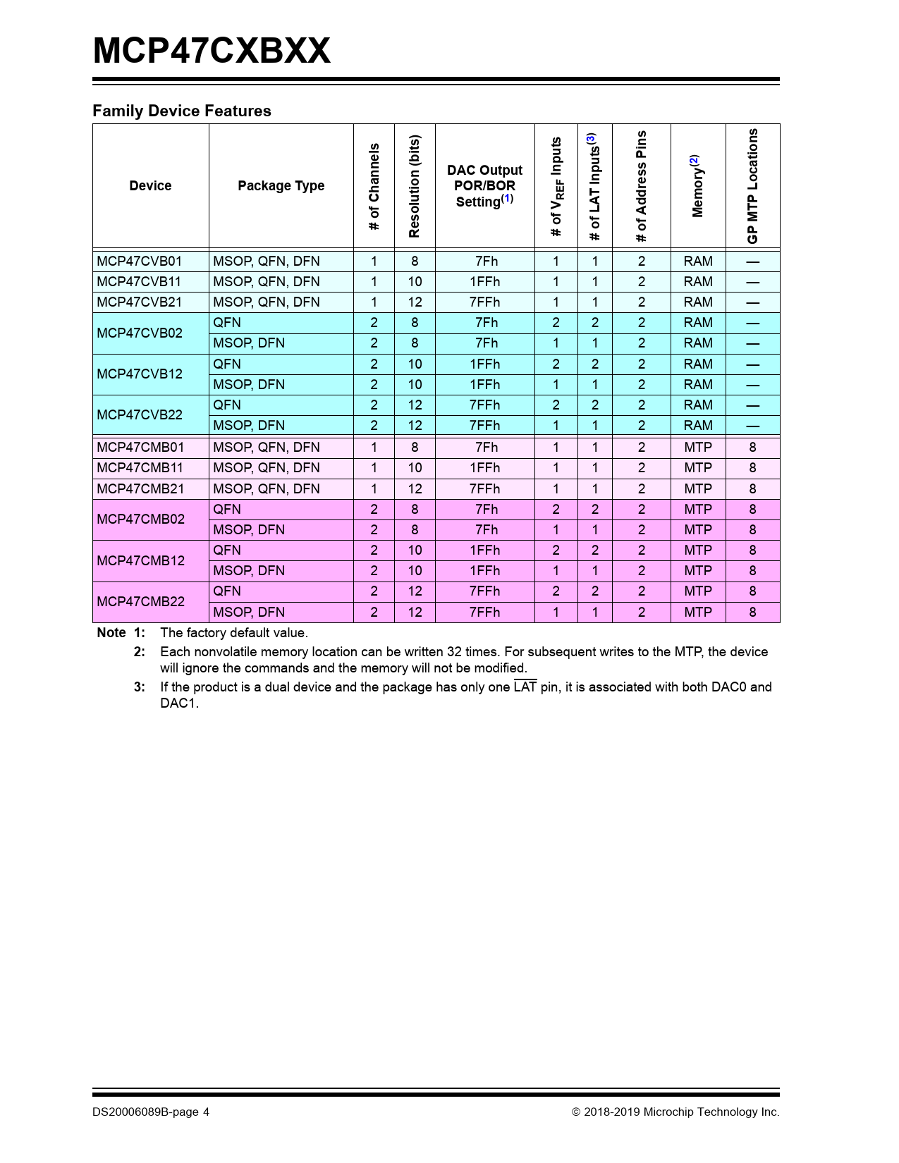 MCP47CVB01 MSOP, QFN, DFN 1 8 7Fh 1 1 2 RAM — MCP47CVB11 MSOP, QFN, DFN 1 10 1FFh 1 1 2 RAM — MCP47CVB21 MSOP, QFN, DFN 1 12 7FFh 1 1 2 RAM — QFN 2 8 7Fh 2 2 2 RAM — MCP47CVB02 MSOP, DFN 2 8 7Fh 1 1 2 RAM — QFN 2 10 1FFh 2 2 2 RAM — MCP47CVB12 MSOP, DFN 2 10 1FFh 1 1 2 RAM — QFN 2 12 7FFh 2 2 2 RAM — MCP47CVB22 MSOP, DFN 2 12 7FFh 1 1 2 RAM — MCP47CMB01 MSOP, QFN, DFN 1 8 7Fh 1 1 2 MTP 8 MCP47CMB11 MSOP, QFN, DFN 1 10 1FFh 1 1 2 MTP 8 MCP47CMB21 MSOP, QFN, DFN 1 12 7FFh 1 1 2 MTP 8 QFN 2 8 7Fh 2 2 2 MTP 8 MCP47CMB02 MSOP, DFN 2 8 7Fh 1 1 2 MTP 8 QFN 2 10 1FFh 2 2 2 MTP 8 MCP47CMB12 MSOP, DFN 2 10 1FFh 1 1 2 MTP 8 QFN 2 12 7FFh 2 2 2 MTP 8 MCP47CMB22 MSOP, DFN 2 12 7FFh 1 1 2 MTP 8