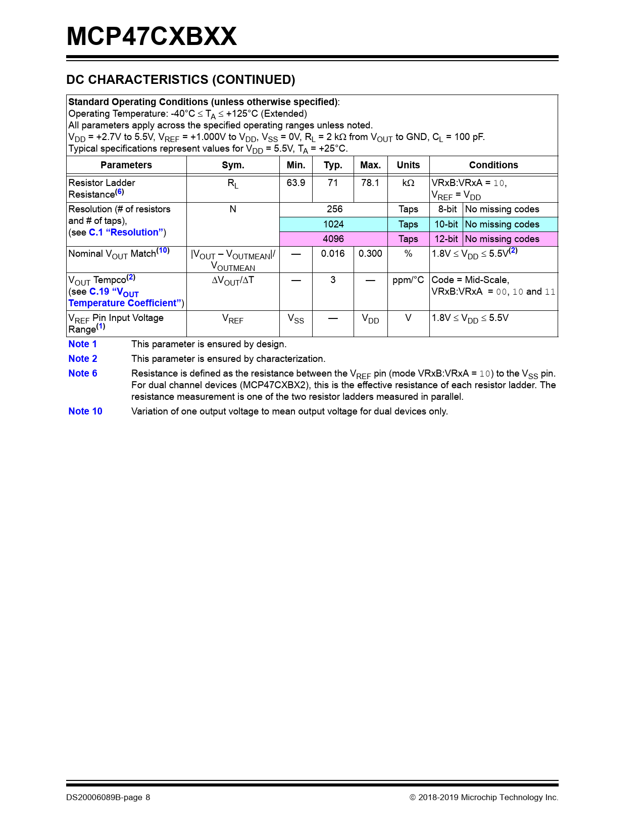 Resistance is defined as the resistance between the VREF pin (mode VRxB:VRxA = 10) to the VSS pin. For dual channel devices (MCP47CXBX2), this is the effective resistance of each resistor ladder. The resistance measurement is one of the two resistor ladders measured in parallel.