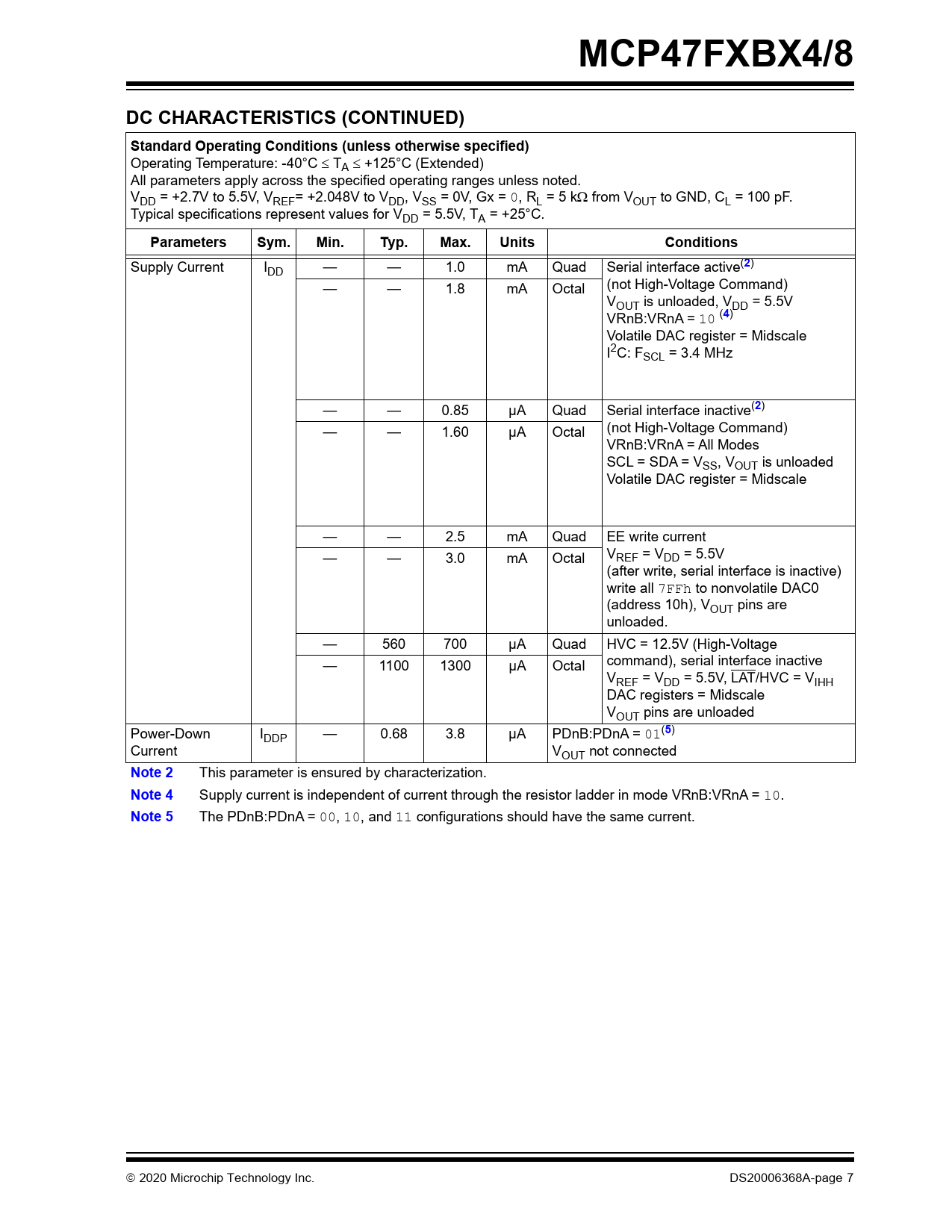 VOUT not connected Note 2 This parameter is ensured by characterization. Note 4 Supply current is independent of current through the resistor ladder in mode VRnB:VRnA = 10. Note 5 The PDnB:PDnA = 00, 10, and 11 configurations should have the same current. 2020 Microchip Technology Inc. DS20006368A-page 7