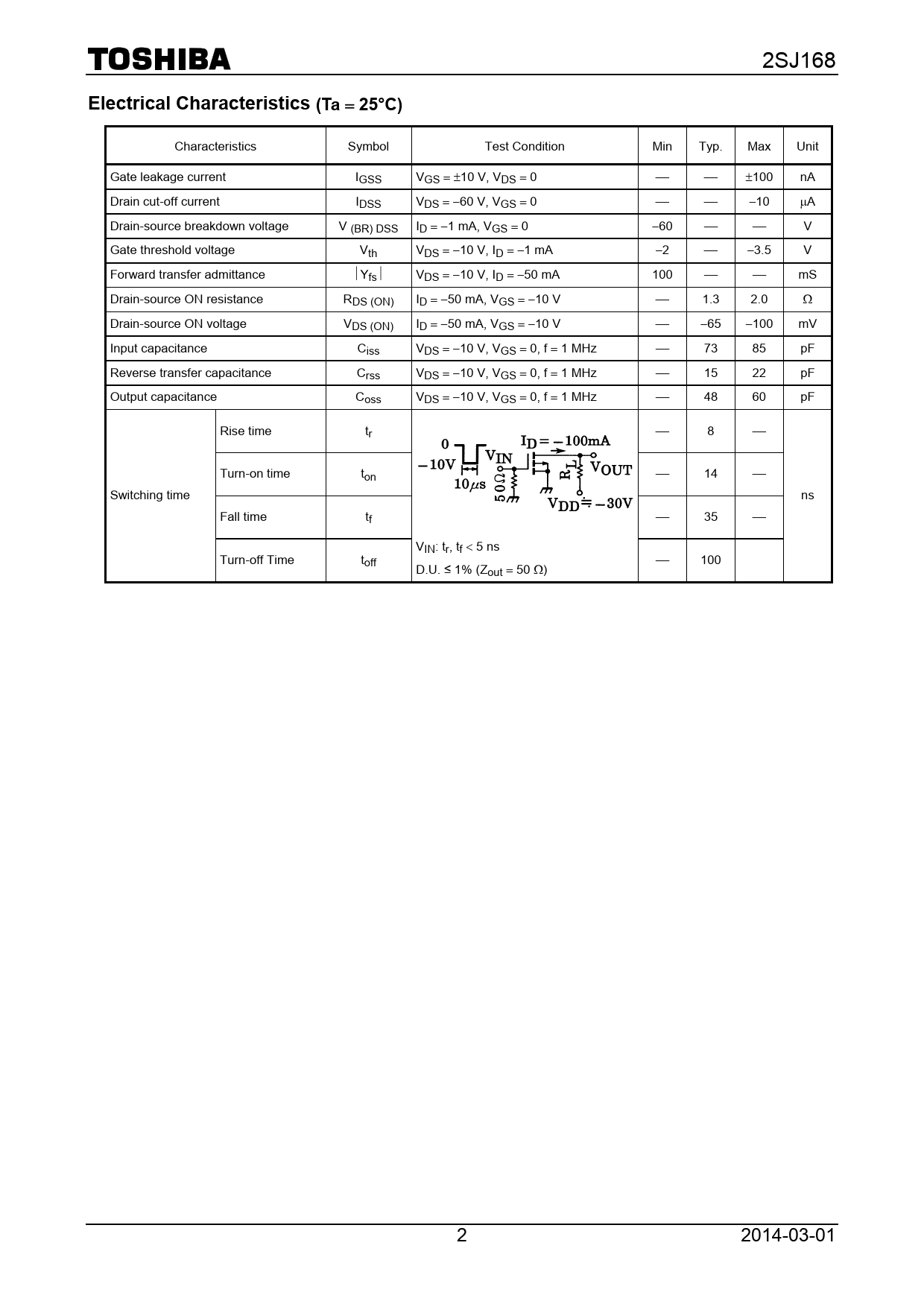 Characteristics Symbol Test Condition Min Typ. Max Unit Gate leakage current IGSS VGS = ±10 V, VDS = 0 ⎯ ⎯ ±100 nA Drain cut-off current IDSS VDS = −60 V, VGS = 0 ⎯ ⎯ −10 μA Drain-source breakdown voltage V (BR) DSS ID = −1 mA, VGS = 0 −60 ⎯ ⎯ V Gate threshold voltage Vth VDS = −10 V, ID = −1 mA −2 ⎯ −3.5 V Forward transfer admittance ⏐Yfs⏐ VDS = −10 V, ID = −50 mA 100 ⎯ ⎯ mS Drain-source ON resistance RDS (ON) ID = −50 mA, VGS = −10 V ⎯ 1.3 2.0 Ω Drain-source ON voltage VDS (ON) ID = −50 mA, VGS = −10 V ⎯ −65 −100 mV Input capacitance Ciss VDS = −10 V, VGS = 0, f = 1 MHz ⎯ 73 85 pF Reverse transfer capacitance Crss VDS = −10 V, VGS = 0, f = 1 MHz ⎯ 15 22 pF Output capacitance Coss VDS = −10 V, VGS = 0, f = 1 MHz ⎯ 48 60 pF Rise time tr ⎯ 8 ⎯ Turn-on time ton ⎯ 14 ⎯ Switching time ns Fall time tf ⎯ 35 ⎯ VIN: tr, tf < 5 ns Turn-off Time toff ⎯ 100 D.U. ≤ 1% (Zout = 50 Ω) 2 2014-03-01 Document Outline TOSHIBA Field Effect Transistor Silicon P Channel MOS Type Absolute Maximum Ratings (Ta 25°C) Marking Electrical Characteristics (Ta 25°C) RESTRICTIONS ON PRODUCT USE