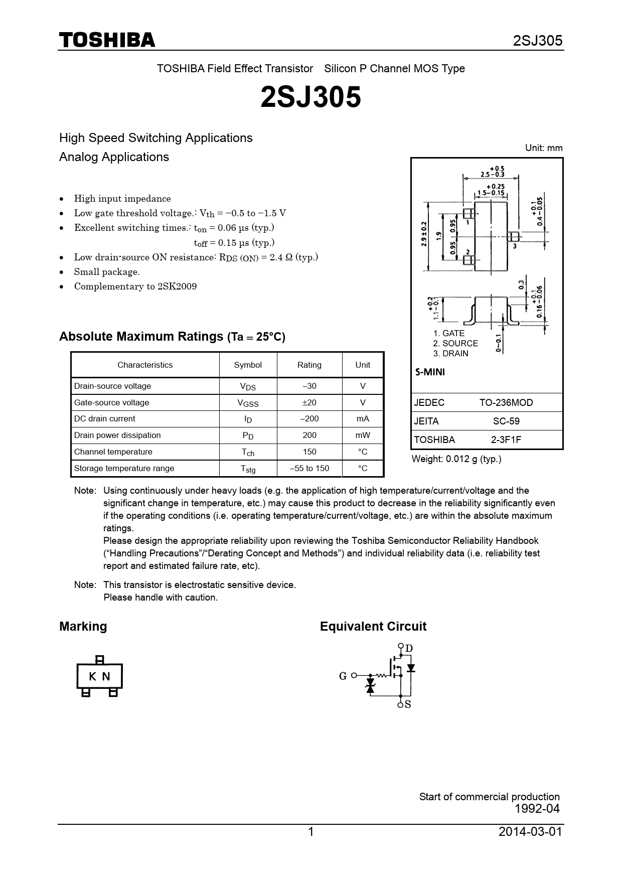 Characteristics Symbol Rating Unit Drain-source voltage V DS −30 V Gate-source voltage VGSS ±20 V JEDEC TO-236MOD DC drain current ID −200 mA JEITA SC-59 Drain power dissipation PD 200 mW TOSHIBA 2-3F1F Channel temperature Tch 150 °C Weight: 0.012 g (typ.) Storage temperature range Tstg −55 to 150 °C Note: Using continuously under heavy loads (e.g. the application of high temperature/current/voltage and the significant change in temperature, etc.) may cause this product to decrease in the reliability significantly even if the operating conditions (i.e. operating temperature/current/voltage, etc.) are within the absolute maximum ratings. Please design the appropriate reliability upon reviewing the Toshiba Semiconductor Reliability Handbook (“Handling Precautions”/“Derating Concept and Methods”) and individual reliability data (i.e. reliability test report and estimated failure rate, etc). Note: This transistor is electrostatic sensitive device. Please handle with caution.