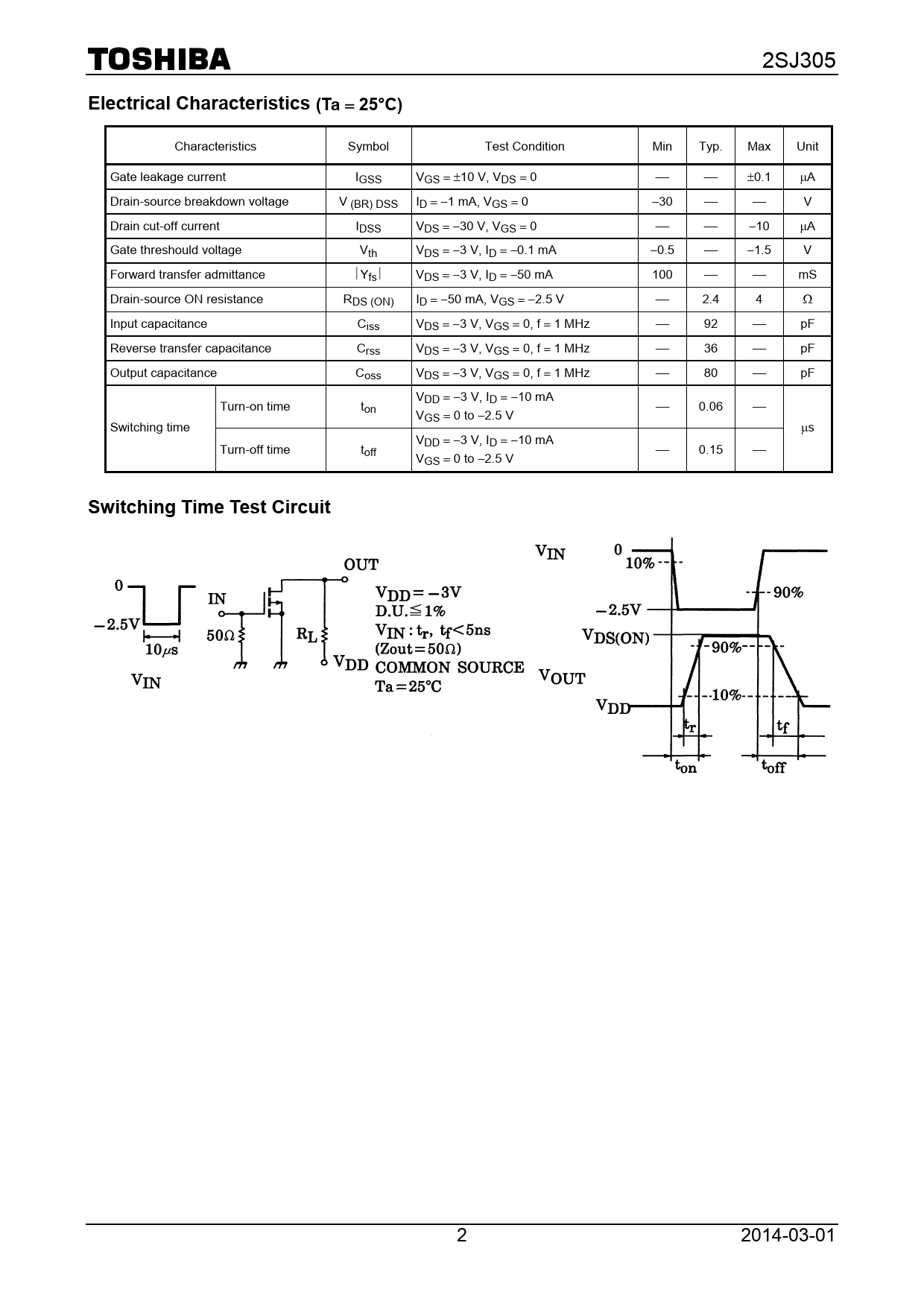 2SJ305 Electrical Characteristics (Ta = 25°C) Characteristics Symbol Test Condition Min Typ. Max Unit Gate leakage current IGSS VGS = ±10 V, VDS = 0 ⎯ ⎯ ±0.1 μA Drain-source breakdown voltage V (BR) DSS ID = −1 mA, VGS = 0 −30 ⎯ ⎯ V Drain cut-off current IDSS VDS = −30 V, VGS = 0 ⎯ ⎯ −10 μA Gate threshould voltage Vth VDS = −3 V, ID = −0.1 mA −0.5 ⎯ −1.5 V Forward transfer admittance ⎪Yfs⎪ VDS = −3 V, ID = −50 mA 100 ⎯ ⎯ mS Drain-source ON resistance RDS (ON) ID = −50 mA, VGS = −2.5 V ⎯ 2.4 4 Ω Input capacitance Ciss VDS = −3 V, VGS = 0, f = 1 MHz ⎯ 92 ⎯ pF Reverse transfer capacitance Crss VDS = −3 V, VGS = 0, f = 1 MHz ⎯ 36 ⎯ pF Output capacitance Coss VDS = −3 V, VGS = 0, f = 1 MHz ⎯ 80 ⎯ pF V Turn-on time t DD = −3 V, ID = −10 mA on ⎯ 0.06 ⎯ VGS = 0 to −2.5 V Switching time μs V Turn-off time t DD = −3 V, ID = −10 mA off ⎯ 0.15 ⎯ VGS = 0 to −2.5 V Switching Time Test Circuit 2 2014-03-01 Document Outline TOSHIBA Field Effect Transistor Silicon P Channel MOS Type Absolute Maximum Ratings (Ta 25°C) Marking Equivalent Circuit Electrical Characteristics (Ta 25°C) Switching Time Test Circuit RESTRICTIONS ON PRODUCT USE