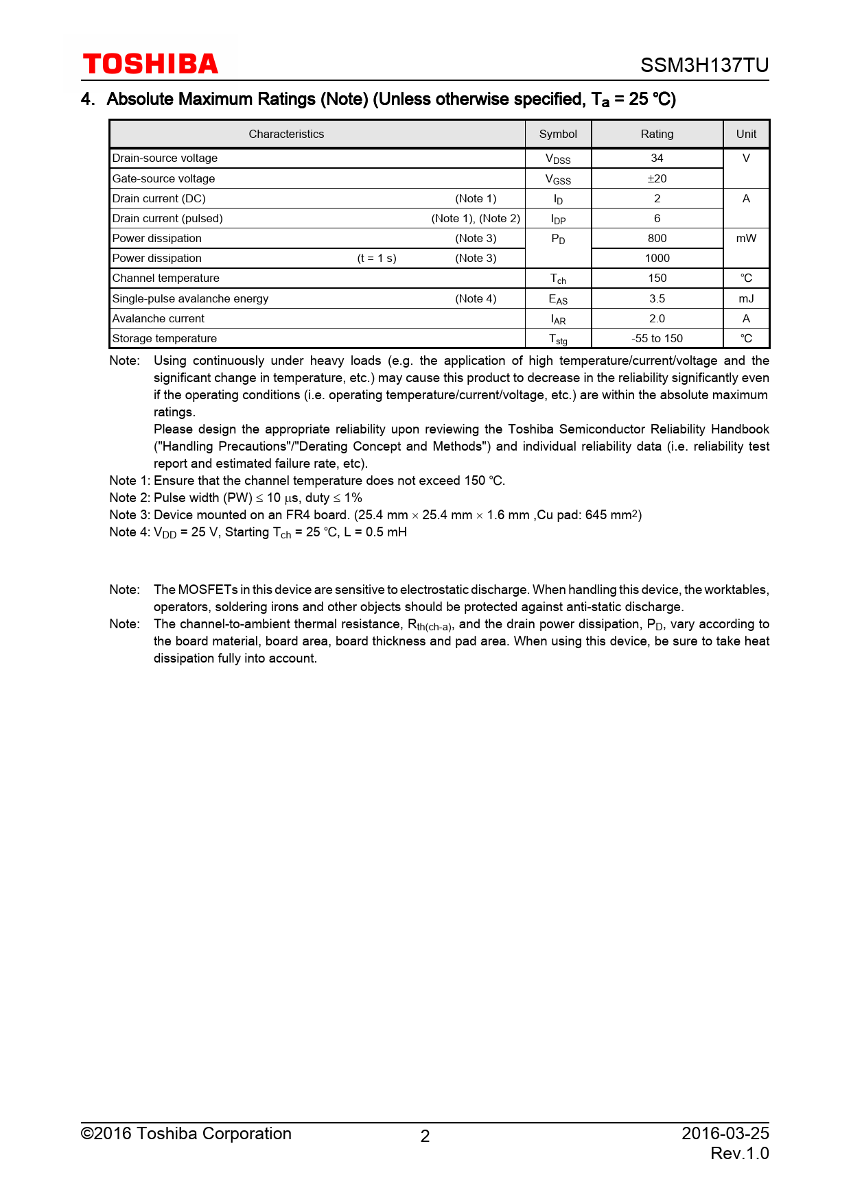 SSM3H137TU 4. Absolute Maximum Ratings (Note) (Unless otherwise specified, Ta = 25 ) Characteristics Symbol Rating Unit Drain-source voltage VDSS 34 V Gate-source voltage VGSS ±20 Drain current (DC) (Note 1) ID 2 A Drain current (pulsed) (Note 1), (Note 2) IDP 6 Power dissipation (Note 3) PD 800 mW Power dissipation (t = 1 s) (Note 3) 1000 Channel temperature Tch 150 Single-pulse avalanche energy (Note 4) EAS 3.5 mJ Avalanche current IAR 2.0 A Storage temperature Tstg -55 to 150 Note: Using continuously under heavy loads (e.g. the application of high temperature/current/voltage and the significant change in temperature, etc.) may cause this product to decrease in the reliability significantly even if the operating conditions (i.e. operating temperature/current/voltage, etc.) are within the absolute maximum ratings. Please design the appropriate reliability upon reviewing the Toshiba Semiconductor Reliability Handbook ("Handling Precautions"/"Derating Concept and Methods") and individual reliability data (i.e. reliability test report and estimated failure rate, etc). Note 1: Ensure that the channel temperature does not exceed 150 . Note 2: Pulse width (PW) ≤ 10 µs, duty ≤ 1% Note 3: Device mounted on an FR4 board. (25.4 mm × 25.4 mm × 1.6 mm ,Cu pad: 645 mm2) Note 4: VDD = 25 V, Starting Tch = 25 , L = 0.5 mH Note: The MOSFETs in this device are sensitive to electrostatic discharge. When handling this device, the worktables, operators, soldering irons and other objects should be protected against anti-static discharge. Note: The channel-to-ambient thermal resistance, Rth(ch-a), and the drain power dissipation, PD, vary according to the board material, board area, board thickness and pad area. When using this device, be sure to take heat dissipation fully into account. ©2016 Toshiba Corporation 2 2016-03-25 Rev.1.0