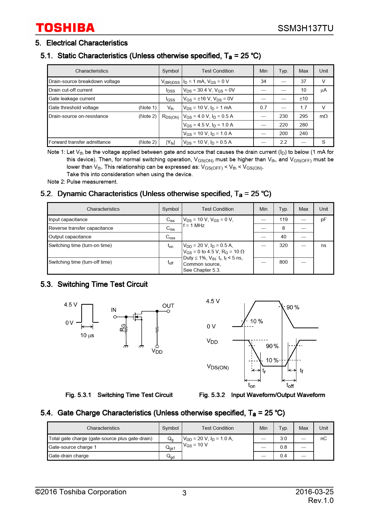 SSM3H137TU 5. Electrical Characteristics 5.1. Static Characteristics (Unless otherwise specified, Ta = 25 ) Characteristics Symbol Test Condition Min Typ. Max Unit Drain-source breakdown voltage V(BR)DSS ID = 1 mA, VGS = 0 V 34 37 V Drain cut-off current IDSS VDS = 30.4 V, VGS = 0V 10 µA Gate leakage current IGSS VGS = ±16 V, VDS = 0V ±10 Gate threshold voltage (Note 1) Vth VDS = 10 V, ID = 1 mA 0.7 1.7 V Drain-source on-resistance (Note 2) RDS(ON) VGS = 4.0 V, ID = 0.5 A 230 295 mΩ VGS = 4.5 V, ID = 1.0 A 220 280 VGS = 10 V, ID = 1.0 A 200 240 Forward transfer admittance (Note 2) |Yfs| VDS = 10 V, ID = 0.5 A 2.2 S Note 1: Let Vth be the voltage applied between gate and source that causes the drain current (ID) to below (1 mA for this device). Then, for normal switching operation, VGS(ON) must be higher than Vth, and VGS(OFF) must be lower than Vth. This relationship can be expressed as: VGS(OFF) < Vth < VGS(ON). Take this into consideration when using the device. Note 2: Pulse measurement. 5.2. Dynamic Characteristics (Unless otherwise specified, Ta = 25 ) Characteristics Symbol Test Condition Min Typ. Max Unit Input capacitance Ciss VDS = 10 V, VGS = 0 V, 119 pF Reverse transfer capacitance C f = 1 MHz rss 8 Output capacitance Coss 40 Switching time (turn-on time) ton VDD = 20 V, ID = 0.5 A, 320 ns VGS = 0 to 4.5 V, RG = 10 Ω Duty ≤ 1%, VIN: tr, tf < 5 ns, Switching time (turn-off time) toff Common source, 800 See Chapter 5.3. 5.3. Switching Time Test Circuit Fig. 5.3.1 Switching Time Test Circuit Fig. 5.3.2 Input Waveform/Output Waveform 5.4. Gate Charge Characteristics (Unless otherwise specified, Ta = 25 ) Characteristics Symbol Test Condition Min Typ. Max Unit Total gate charge (gate-source plus gate-drain) Qg VDD = 20 V, ID = 1.0 A, 3.0 nC Gate-source charge 1 Q VGS = 10 V gs1 0.8 Gate-drain charge Qgd 0.4 ©2016 Toshiba Corporation 3 2016-03-25 Rev.1.0