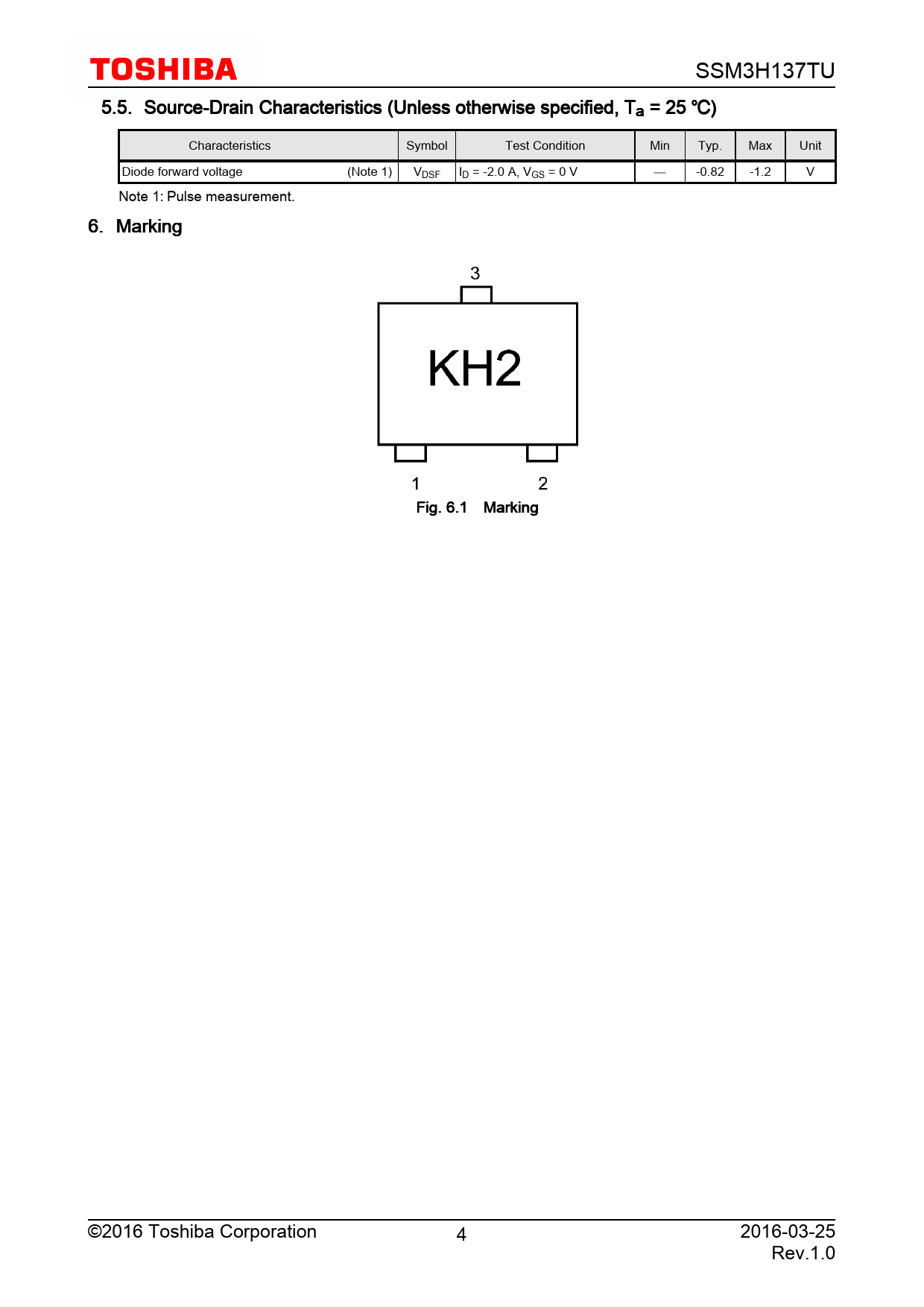 SSM3H137TU 5.5. Source-Drain Characteristics (Unless otherwise specified, Ta = 25 ) Characteristics Symbol Test Condition Min Typ. Max Unit Diode forward voltage (Note 1) VDSF ID = -2.0 A, VGS = 0 V -0.82 -1.2 V Note 1: Pulse measurement. 6. Marking Fig. 6.1 Marking ©2016 Toshiba Corporation 4 2016-03-25 Rev.1.0