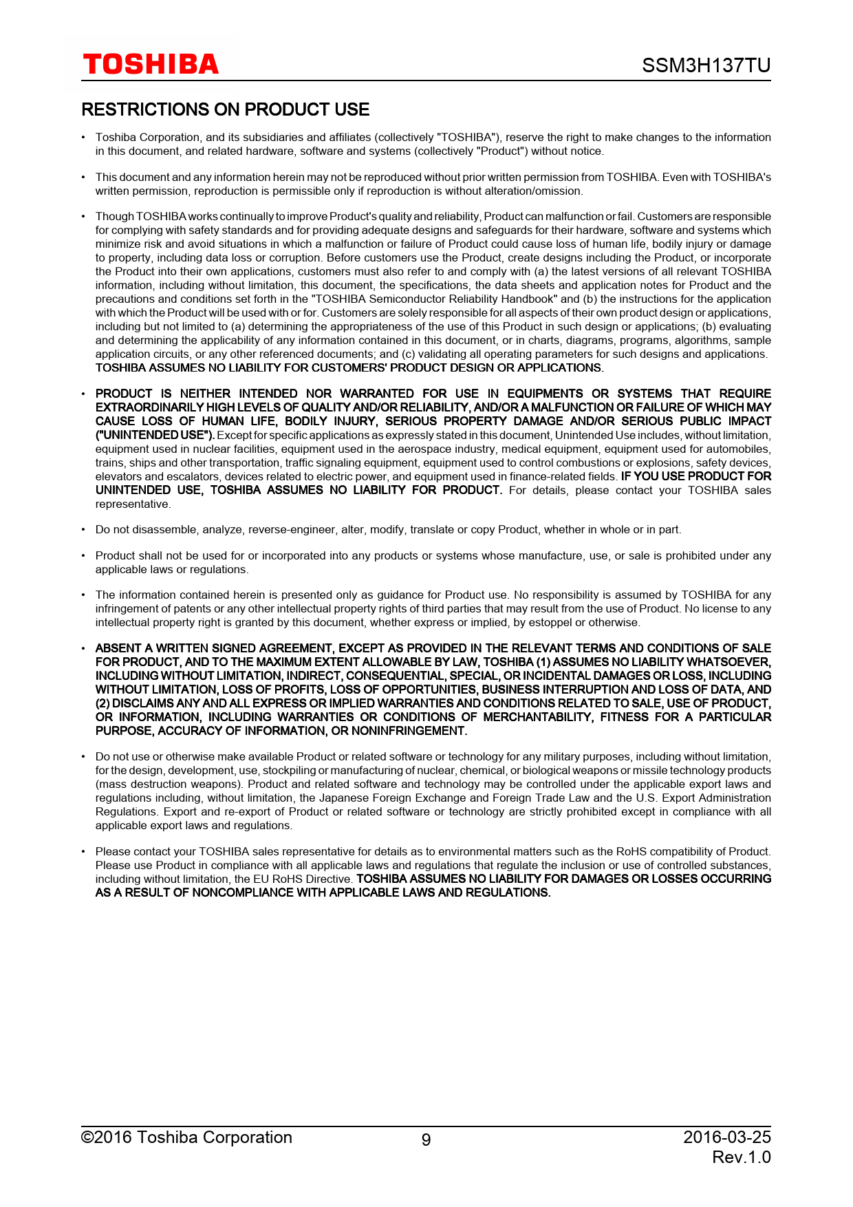 SSM3H137TU. RESTRICTIONS. ON. PRODUCT. USE. •. Toshiba. Corporation,. and. its. subsidiaries. and. affiliates. (collectively. "TOSHIBA"),
