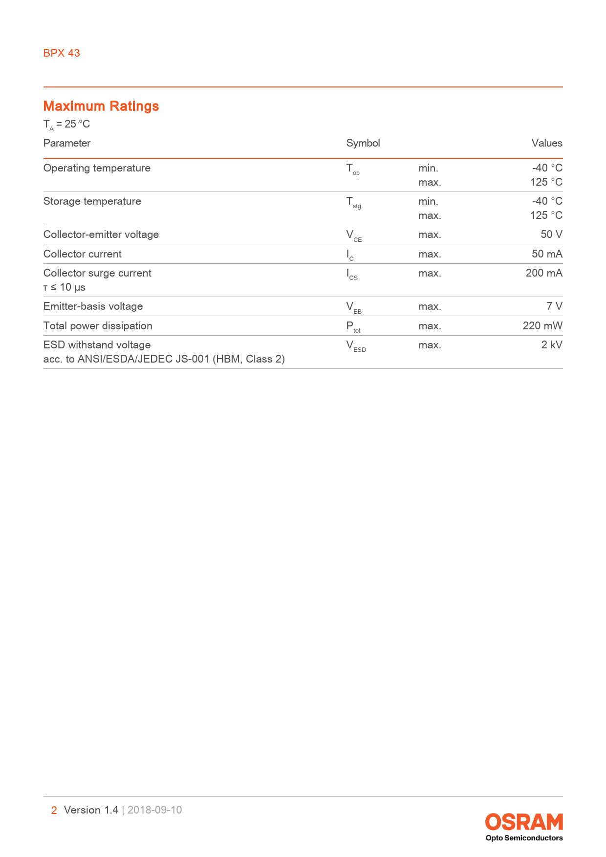 BPX 43 Maximum Ratings T = 25 °C A Parameter Symbol Values Operating temperature T min. -40 °C op max. 125 °C Storage temperature T min. -40 °C stg max. 125 °C Collector-emitter voltage V max. 50 V CE Collector current I max. 50 mA C Collector surge current I max. 200 mA CS τ ≤ 10 µs Emitter-basis voltage V max. 7 V EB Total power dissipation P max. 220 mW tot ESD withstand voltage V max. 2 kV ESD acc. to ANSI/ESDA/JEDEC JS-001 (HBM, Class 2) 2 Version 1.4 | 2018-09-10