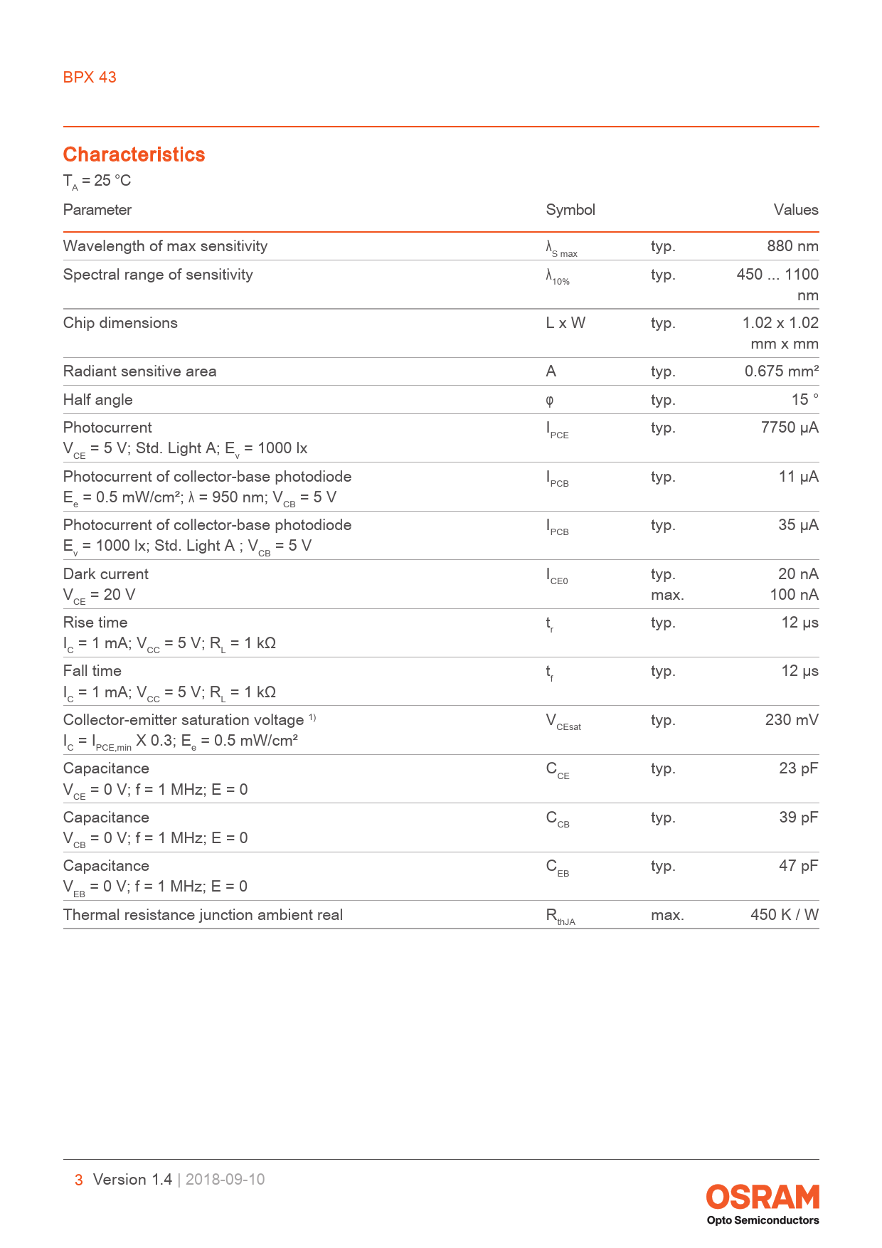 link to page 13 BPX 43 Characteristics T = 25 °C A Parameter Symbol Values Wavelength of max sensitivity λ typ. 880 nm S max Spectral range of sensitivity λ typ. 450 ... 1100 10% nm Chip dimensions L x W typ. 1.02 x 1.02 mm x mm Radiant sensitive area A typ. 0.675 mm² Half angle φ typ. 15 ° Photocurrent I typ. 7750 µA PCE V = 5 V; Std. Light A; E = 1000 lx CE v Photocurrent of collector-base photodiode I typ. 11 µA PCB E = 0.5 mW/cm²; λ = 950 nm; V = 5 V e CB Photocurrent of collector-base photodiode I typ. 35 µA PCB E = 1000 lx; Std. Light A ; V = 5 V v CB Dark current I typ. 20 nA CE0 V = 20 V max. 100 nA CE Rise time t typ. 12 µs r I = 1 mA; V = 5 V; R = 1 kΩ C CC L Fall time t typ. 12 µs f I = 1 mA; V = 5 V; R = 1 kΩ C CC L Collector-emitter saturation voltage 1) V typ. 230 mV CEsat I = I X 0.3; E = 0.5 mW/cm² C PCE,min e Capacitance C typ. 23 pF CE V = 0 V; f = 1 MHz; E = 0 CE Capacitance C typ. 39 pF CB V = 0 V; f = 1 MHz; E = 0 CB Capacitance C typ. 47 pF EB V = 0 V; f = 1 MHz; E = 0 EB Thermal resistance junction ambient real R max. 450 K / W thJA 3 Version 1.4 | 2018-09-10
