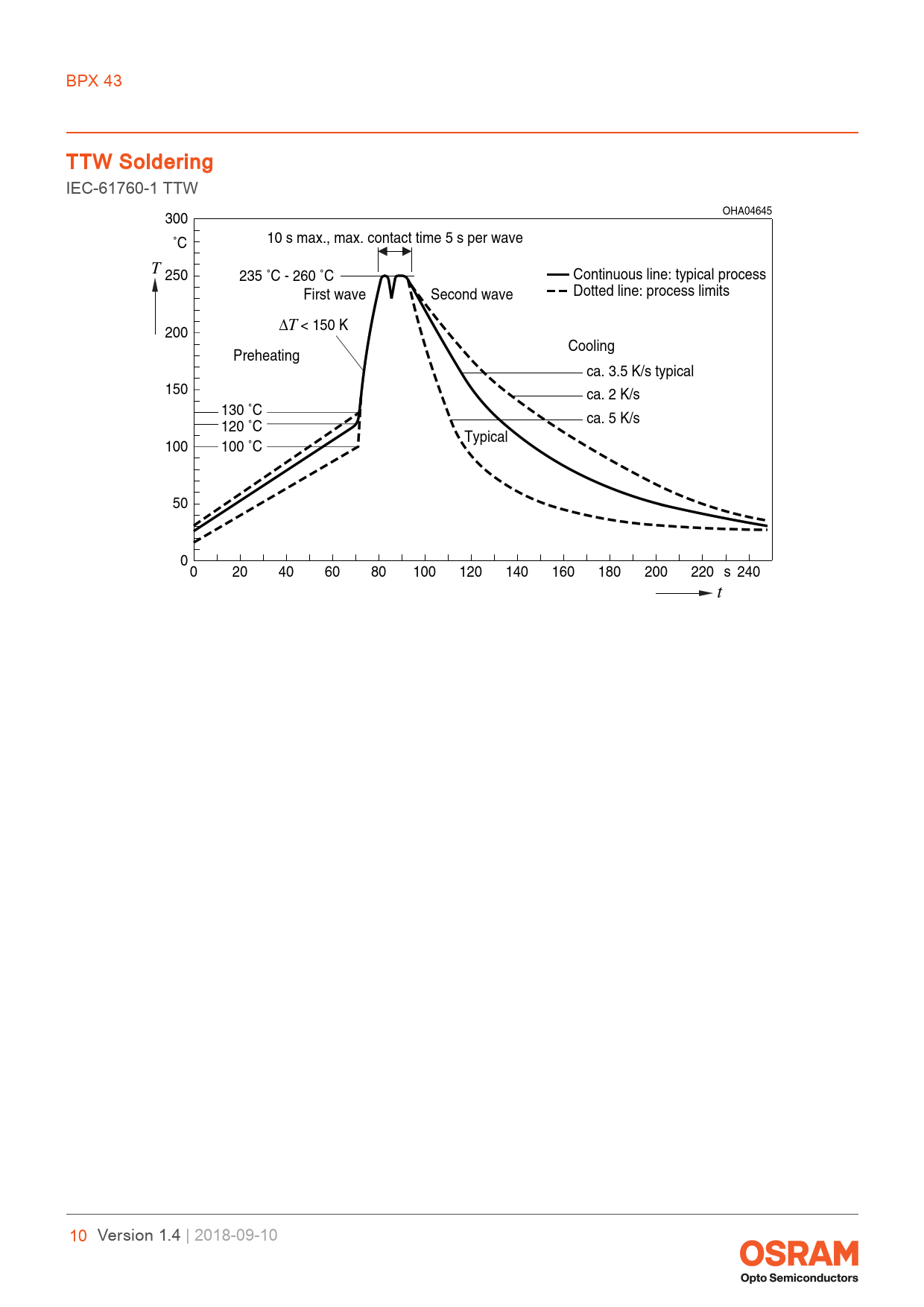 BPX. 43. TTW. Soldering. IEC-61760-1. TTW. OHA04645. 300. ˚C. 10. s. max.,. max. contact. time. 5. s. per. wave. T. 250. 235. ˚C. -. 260. ˚C. Continuous. line:. typical. process