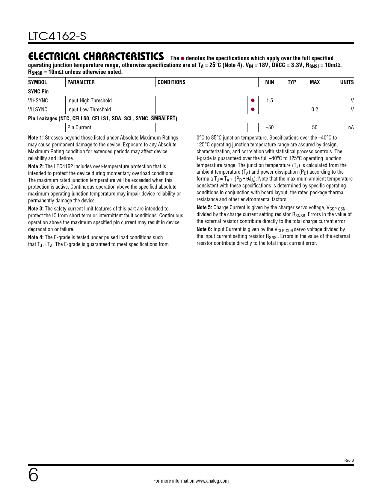 LTC4162-S ELECTRICAL CHARACTERISTICS The l denotes the specifications which apply over the full specifiedoperating junction temperature range, otherwise specifications are at TA = 25°C (Note 4). VIN = 18V, DVCC = 3.3V, RSNSI = 10mΩ,RSNSB = 10mΩ unless otherwise noted. SYMBOLPARAMETERCONDITIONSMINTYPMAXUNITSSYNC Pin VIHSYNC Input High Threshold l 1.5 V VILSYNC Input Low Threshold l 0.2 V Pin Leakages (NTC, CELLS0, CELLS1, SDA, SCL, SYNC, SMBALERT) Pin Current –50 50 nA Note 1: Stresses beyond those listed under Absolute Maximum Ratings 0°C to 85°C junction temperature. Specifications over the –40°C to may cause permanent damage to the device. Exposure to any Absolute 125°C operating junction temperature range are assured by design, Maximum Rating condition for extended periods may affect device characterization, and correlation with statistical process controls. The reliability and lifetime. I-grade is guaranteed over the full –40°C to 125°C operating junction Note 2: The LTC4162 includes over-temperature protection that is temperature range. The junction temperature (TJ) is calculated from the intended to protect the device during momentary overload conditions. ambient temperature (TA) and power dissipation (PD) according to the The maximum rated junction temperature will be exceeded when this formula TJ = TA + (PD • θJA). Note that the maximum ambient temperature protection is active. Continuous operation above the specified absolute consistent with these specifications is determined by specific operating maximum operating junction temperature may impair device reliability or conditions in conjunction with board layout, the rated package thermal permanently damage the device. resistance and other environmental factors. Note 3: The safety current limit features of this part are intended to Note 5: Charge Current is given by the charger servo voltage, VCSP-CSN, protect the IC from short term or intermittent fault conditions. Continuous divided by the charge current setting resistor RSNSB. Errors in the value of operation above the maximum specified pin current may result in device the external resistor contribute directly to the total charge current error. degradation or failure. Note 6: Input Current is given by the VCLP-CLN servo voltage divided by Note 4: The E-grade is tested under pulsed load conditions such the input current setting resistor RSNSI. Errors in the value of the external that T resistor contribute directly to the total input current error. J ≈ TA. The E-grade is guaranteed to meet specifications from Rev B 6 For more information www.analog.com Document Outline Features Applications Typical Application Description Absolute Maximum Ratings Order Information Pin Configuration Electrical Characteristics Typical Performance Characteristics Pin Functions Block Diagram ESD Diagram Timing Diagram Operation Applications Information Register Descriptions Typical Applications Package Description Revision History Typical Application Related Parts
