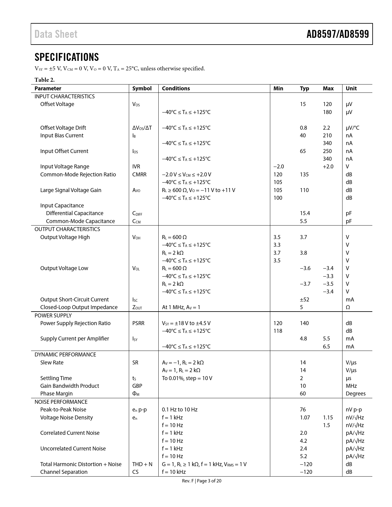 Data Sheet AD8597/AD8599 SPECIFICATIONS Table 2 Parameter Symbol Conditions Min Typ Max Unit