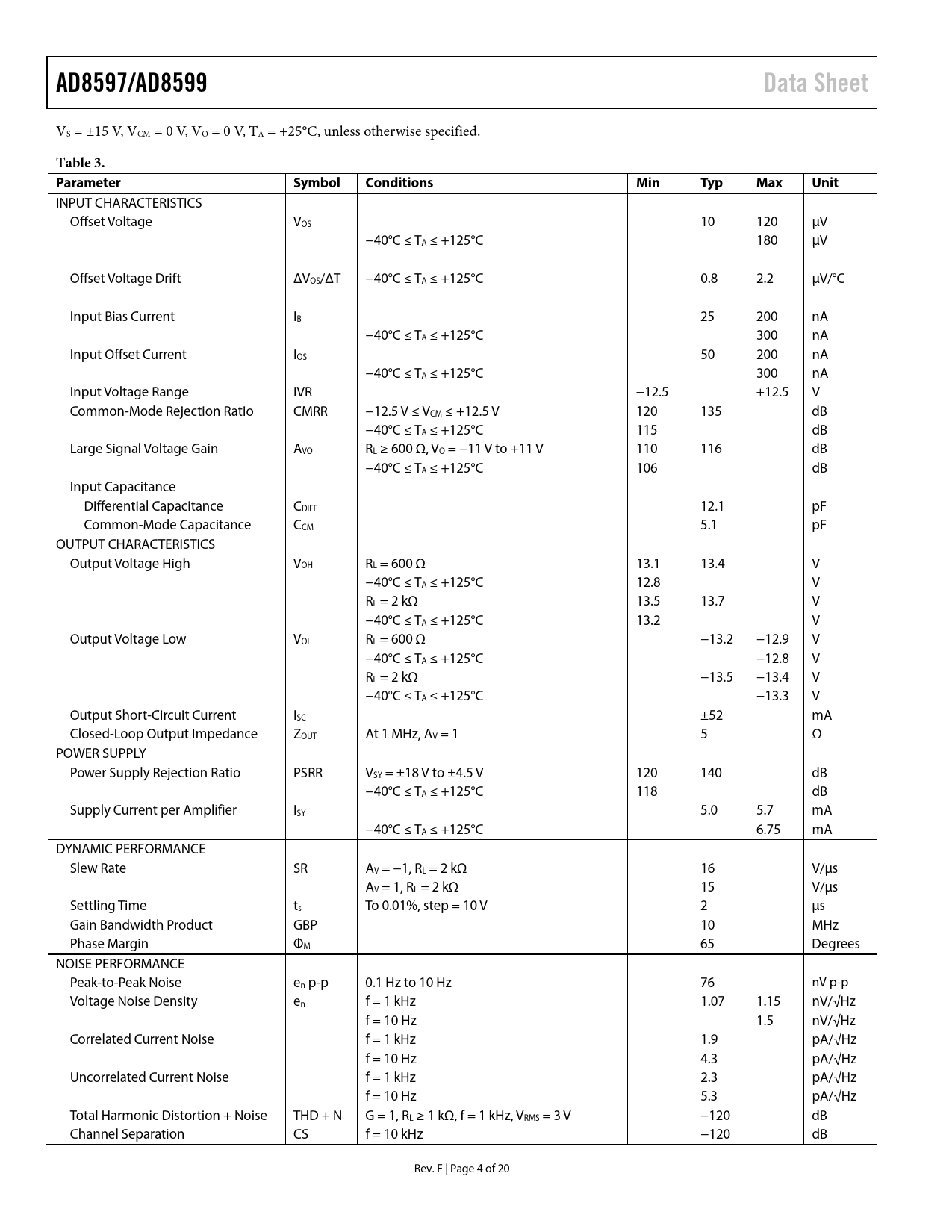 AD8597/AD8599Data Sheet VS = ±15 V, VCM = 0 V, VO = 0 V, TA = +25°C, unless otherwise specified. Table 3. ParameterSymbolConditionsMinTypMaxUnit INPUT CHARACTERISTICS Offset Voltage VOS 10 120 μV −40°C ≤ TA ≤ +125°C 180 μV Offset Voltage Drift ΔVOS/ΔT −40°C ≤ TA ≤ +125°C 0.8 2.2 μV/°C Input Bias Current IB 25 200 nA −40°C ≤ TA ≤ +125°C 300 nA Input Offset Current IOS 50 200 nA −40°C ≤ TA ≤ +125°C 300 nA Input Voltage Range IVR −12.5 +12.5 V Common-Mode Rejection Ratio CMRR −12.5 V ≤ VCM ≤ +12.5 V 120 135 dB −40°C ≤ TA ≤ +125°C 115 dB Large Signal Voltage Gain AVO RL ≥ 600 Ω, VO = −11 V to +11 V 110 116 dB −40°C ≤ TA ≤ +125°C 106 dB Input Capacitance Differential Capacitance CDIFF 12.1 pF Common-Mode Capacitance CCM 5.1 pF OUTPUT CHARACTERISTICS Output Voltage High VOH RL = 600 Ω 13.1 13.4 V −40°C ≤ TA ≤ +125°C 12.8 V RL = 2 kΩ 13.5 13.7 V −40°C ≤ TA ≤ +125°C 13.2 V Output Voltage Low VOL RL = 600 Ω −13.2 −12.9 V −40°C ≤ TA ≤ +125°C −12.8 V RL = 2 kΩ −13.5 −13.4 V −40°C ≤ TA ≤ +125°C −13.3 V Output Short-Circuit Current ISC ±52 mA Closed-Loop Output Impedance ZOUT At 1 MHz, AV = 1 5 Ω POWER SUPPLY Power Supply Rejection Ratio PSRR VSY = ±18 V to ±4.5 V 120 140 dB −40°C ≤ TA ≤ +125°C 118 dB Supply Current per Amplifier ISY 5.0 5.7 mA −40°C ≤ TA ≤ +125°C 6.75 mA DYNAMIC PERFORMANCE Slew Rate SR AV = −1, RL = 2 kΩ 16 V/μs AV = 1, RL = 2 kΩ 15 V/μs Settling Time ts To 0.01%, step = 10 V 2 μs Gain Bandwidth Product GBP 10 MHz Phase Margin ΦM 65 Degrees NOISE PERFORMANCE Peak-to-Peak Noise en p-p 0.1 Hz to 10 Hz 76 nV p-p Voltage Noise Density en f = 1 kHz 1.07 1.15 nV/√Hz f = 10 Hz 1.5 nV/√Hz Correlated Current Noise f = 1 kHz 1.9 pA/√Hz f = 10 Hz 4.3 pA/√Hz Uncorrelated Current Noise f = 1 kHz 2.3 pA/√Hz f = 10 Hz 5.3 pA/√Hz Total Harmonic Distortion + Noise THD + N G = 1, RL ≥ 1 kΩ, f = 1 kHz, VRMS = 3 V −120 dB Channel Separation CS f = 10 kHz −120 dB Rev. F | Page 4 of 20 Document Outline FEATURES APPLICATIONS PIN CONFIGURATIONS GENERAL DESCRIPTION REVISION HISTORY SPECIFICATIONS ABSOLUTE MAXIMUM RATINGS THERMAL RESISTANCE POWER SEQUENCING ESD CAUTION TYPICAL PERFORMANCE CHARACTERISTICS FUNCTIONAL OPERATION INPUT VOLTAGE RANGE OUTPUT PHASE REVERSAL NOISE AND SOURCE IMPEDANCE CONSIDERATIONS OUTLINE DIMENSIONS ORDERING GUIDE