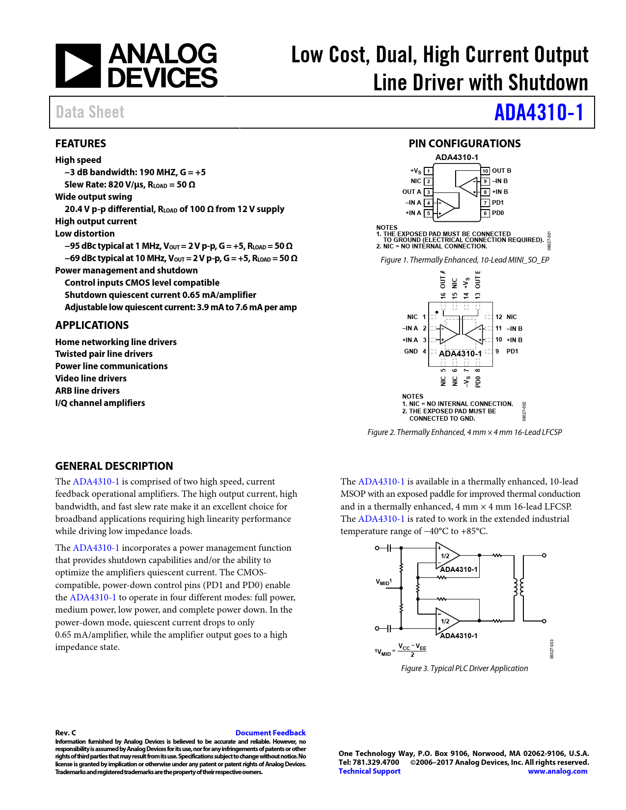 The ADA4310-1 is comprised of two high speed, current The ADA4310-1 is available in a thermally enhanced, 10-lead feedback operational amplifiers. The high output current, high MSOP with an exposed paddle for improved thermal conduction bandwidth, and fast slew rate make it an excel ent choice for and in a thermally enhanced, 4 mm × 4 mm 16-lead LFCSP. broadband applications requiring high linearity performance The ADA4310-1 is rated to work in the extended industrial while driving low impedance loads. temperature range of −40°C to +85°C. The ADA4310-1 incorporates a power management function that provides shutdown capabilities and/or the ability to