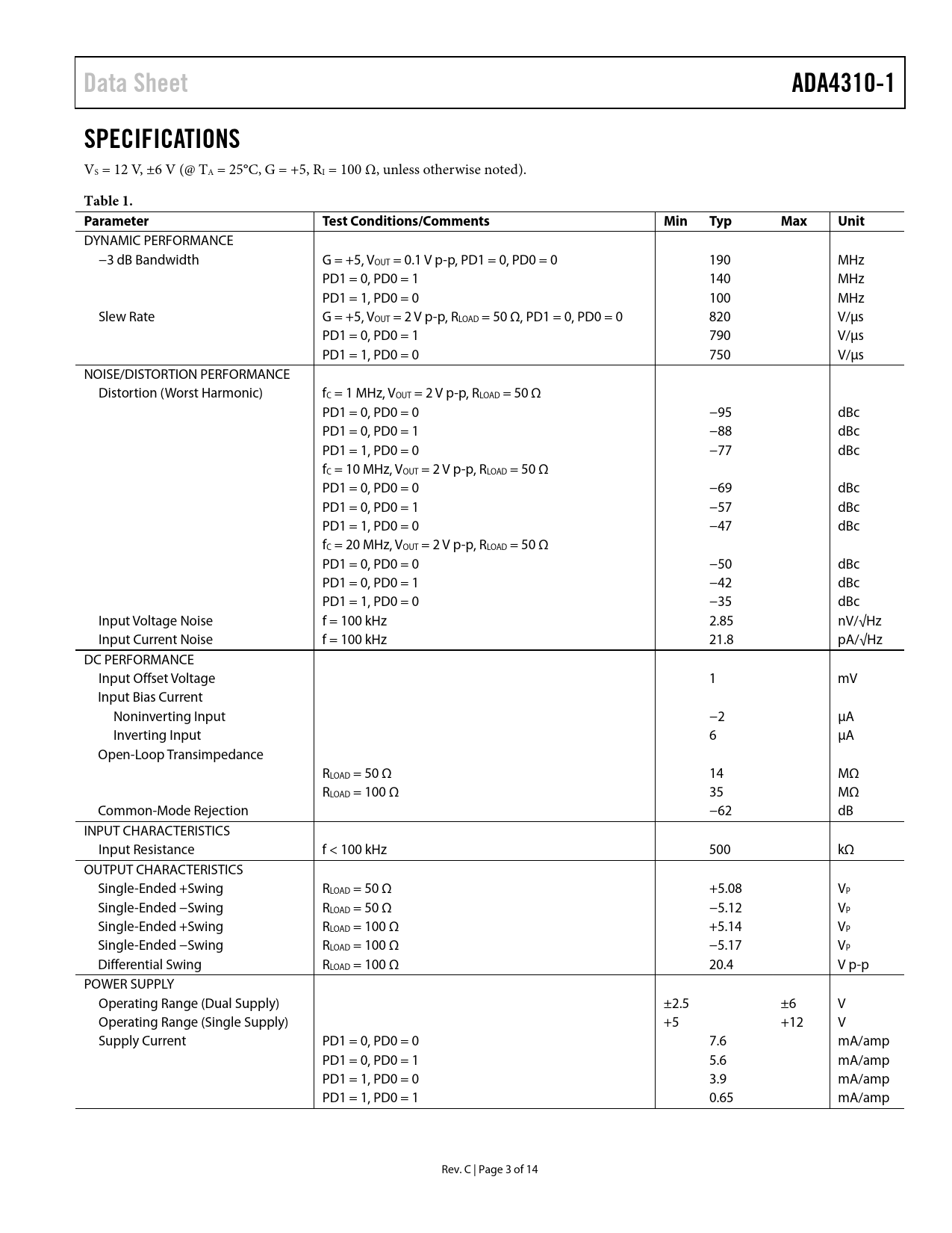 | Páginas / Página | 14 / 3 — Data Sheet. ADA4310-1. SPECIFICATIONS. Table 1. Parameter. Test … |