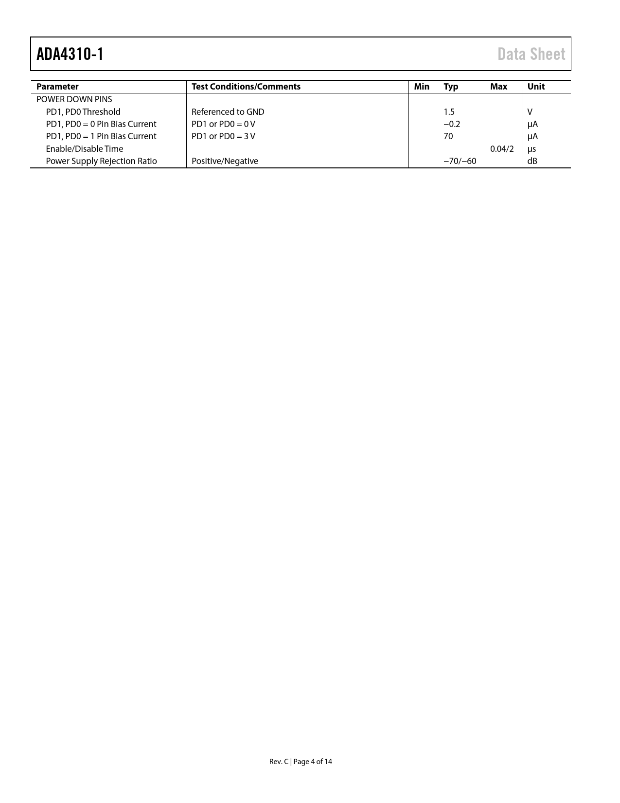 ADA4310-1Data SheetParameterTest Conditions/CommentsMinTypMaxUnit POWER DOWN PINS PD1, PD0 Threshold Referenced to GND 1.5 V PD1, PD0 = 0 Pin Bias Current PD1 or PD0 = 0 V −0.2 µA PD1, PD0 = 1 Pin Bias Current PD1 or PD0 = 3 V 70 µA Enable/Disable Time 0.04/2 µs Power Supply Rejection Ratio Positive/Negative −70/−60 dB Rev. C | Page 4 of 14 Document Outline FEATURES APPLICATIONS PIN CONFIGURATIONS GENERAL DESCRIPTION REVISION HISTORY SPECIFICATIONS ABSOLUTE MAXIMUM RATINGS THERMAL RESISTANCE Maximum Power Dissipation ESD CAUTION PIN CONFIGURATION AND FUNCTION DESCRIPTIONS TYPICAL PERFORMANCE CHARACTERISTICS THEORY OF OPERATION APPLICATIONS INFORMATION FEEDBACK RESISTOR SELECTION POWER CONTROL MODES OF OPERATION EXPOSED THERMAL PAD CONNECTIONS POWER LINE APPLICATION BOARD LAYOUT POWER SUPPLY BYPASSING OUTLINE DIMENSIONS ORDERING GUIDE