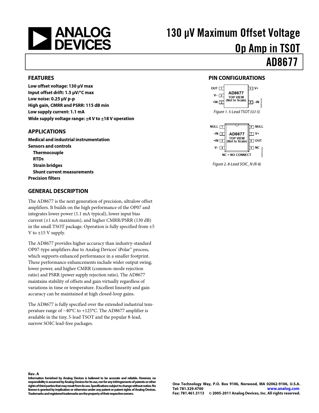 130 μV Maximum Offset Voltage. Op Amp in TSOT. AD8677. FEATURES. PIN CONFIGURATIONS. Low offset voltage: 130 μV max. OUT 1