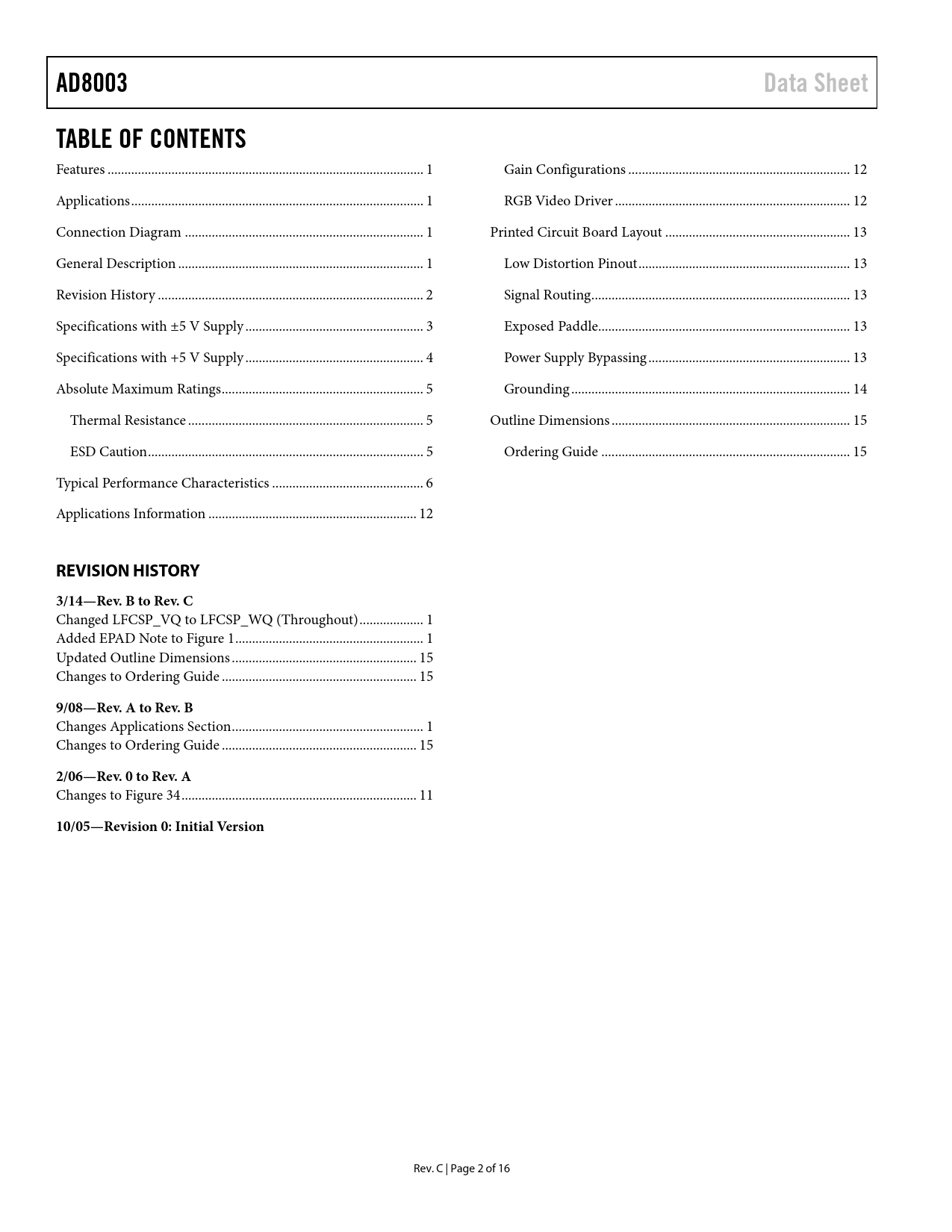 AD8003 Data Sheet TABLE OF CONTENTS REVISION HISTORY 3/14—Rev B to Rev C 9/08—Rev A to Rev B 2/06—Rev 0 to Rev A