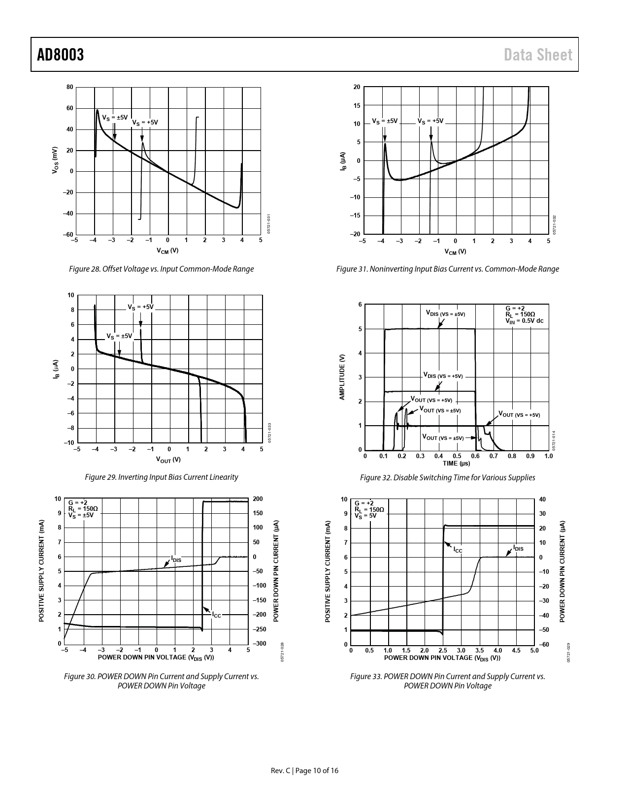 AD8003Data Sheet80206015VS = ±5V VS = +5V10VS = ±5VVS = +5V405V)20)(m0(µAOSV0I B–5–20–10–40 31 –15 2 0 03 1- 1- 72 72 05 –60 05 –20–5–4–3–2–1012345–5–4–3–2–1012345VCM (V)VCM (V) Figure 28. Offset Voltage vs. Input Common-Mode Range Figure 31. Noninverting Input Bias Current vs. Common-Mode Range 1068VS = +5VG = +2VDIS (VS = ±5V)RL = 150ΩV6IN = 0.5V dc5V4S = ±5V2)4V ( A)0E( I BUD3VDIS (VS = +5V)–2IT L P–4AM2VOUT (VS = +5V)V–6OUT (VS = ±5V)VOUT (VS = +5V) 3 –81 03 1- 14 72 V 0 OUT (VS = ±5V) 05 –10 1- –5–4–3–2–1012345 572 0 0V00.10.20.30.40.50.60.70.80.91.0OUT (V)TIME (µs) Figure 29. Inverting Input Bias Current Linearity Figure 32. Disable Switching Time for Various Supplies 10200G = +21040G = +2RL = 150ΩR9L = 150ΩV150930S = ±5VV))S = 5V)A)8AAAm100820((µm(µTT( TT750NNEN710ENRIRIDISCCRRRE6RRREU0IDIS6U0Y C5–50IN CUY C5–10IN CUPPLN PPPLN PU4–100WU4–20WIVE S3–150R DOIVE S3–30R DOTETESIW2ISIWCC–200O2–40OPOPPOP1–2501–50 8 0–300 9 0–60 02 –5–4–3–2–1012345 02 1- 00.51.01.52.02.53.03.54.04.55.0 1- 72 POWER DOWN PIN VOLTAGE (VDIS (V)) 72 POWER DOWN PIN VOLTAGE (V 05 DIS (V)) 05 Figure 30. POWER DOWN Pin Current and Supply Current vs. Figure 33. POWER DOWN Pin Current and Supply Current vs. POWER DOWN Pin Voltage POWER DOWN Pin Voltage Rev. C | Page 10 of 16 Document Outline Features Applications Connection Diagram General Description Table of Contents Revision History Specifications with ±5 V Supply Specifications with +5 V Supply Absolute Maximum Ratings Thermal Resistance Maximum Power Dissipation ESD Caution Typical Performance Characteristics Applications Information Gain Configurations RGB Video Driver Printed Circuit Board Layout Low Distortion Pinout Signal Routing Exposed Paddle Power Supply Bypassing Grounding Outline Dimensions Ordering Guide