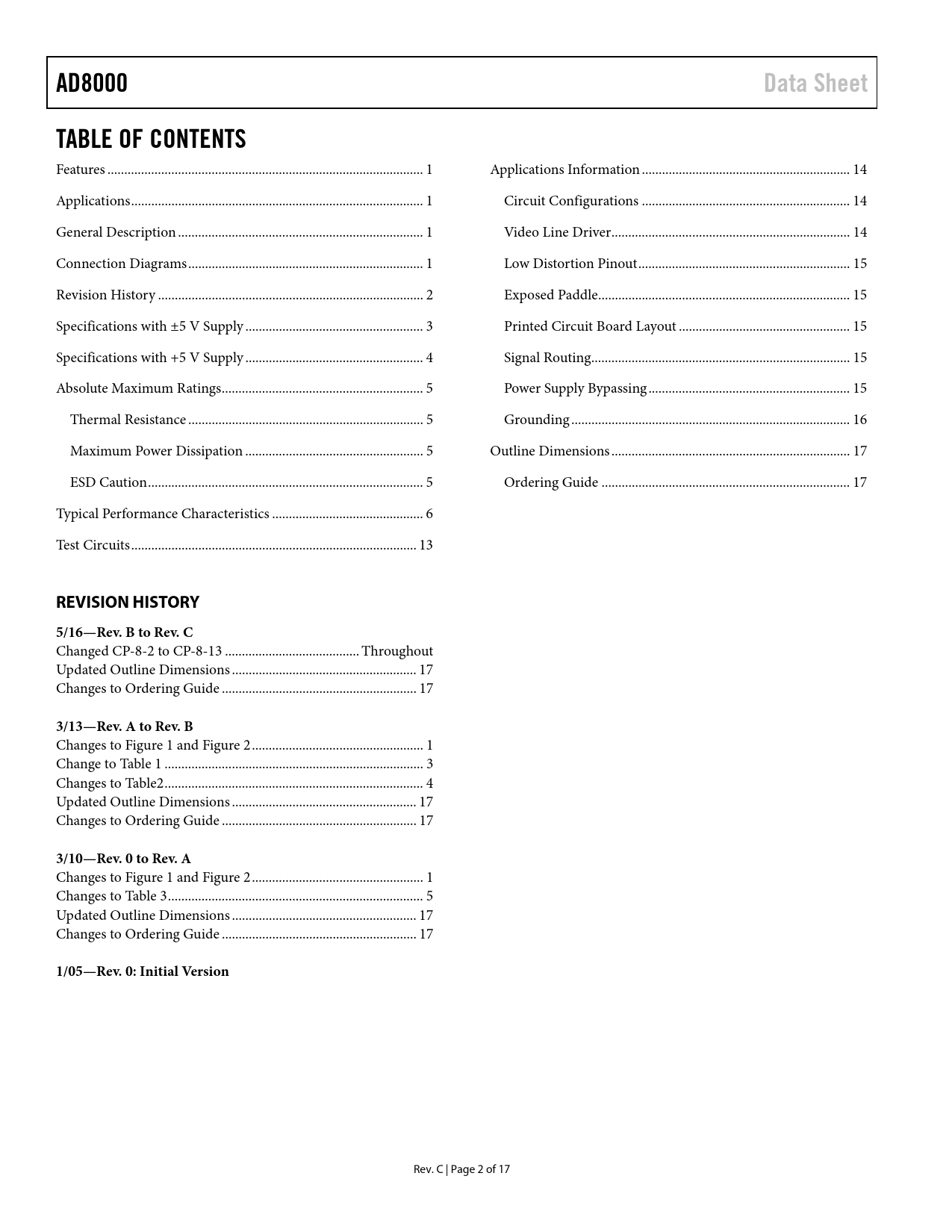 Páginas / Página17 / 2 — AD8000. Data Sheet. TABLE OF CONTENTS. REVISION HISTORY. 5/16—Rev. B to …