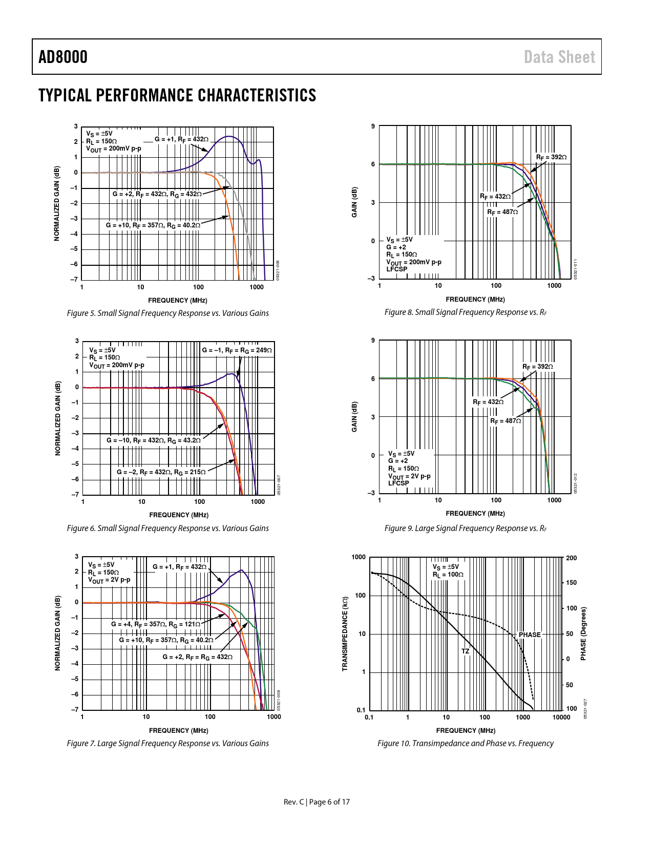 Figure 7. Large Signal Frequency Response vs. Various Gains Figure 10. Transimpedance and Phase vs. Frequency Rev. C | Page 6 of 17 Document Outline FEATURES APPLICATIONS GENERAL DESCRIPTION CONNECTION DIAGRAMS TABLE OF CONTENTS REVISION HISTORY SPECIFICATIONS WITH ±5 V SUPPLY SPECIFICATIONS WITH +5 V SUPPLY ABSOLUTE MAXIMUM RATINGS THERMAL RESISTANCE MAXIMUM POWER DISSIPATION ESD CAUTION TYPICAL PERFORMANCE CHARACTERISTICS TEST CIRCUITS APPLICATIONS INFORMATION CIRCUIT CONFIGURATIONS VIDEO LINE DRIVER LOW DISTORTION PINOUT EXPOSED PADDLE PRINTED CIRCUIT BOARD LAYOUT SIGNAL ROUTING POWER SUPPLY BYPASSING GROUNDING OUTLINE DIMENSIONS ORDERING GUIDE