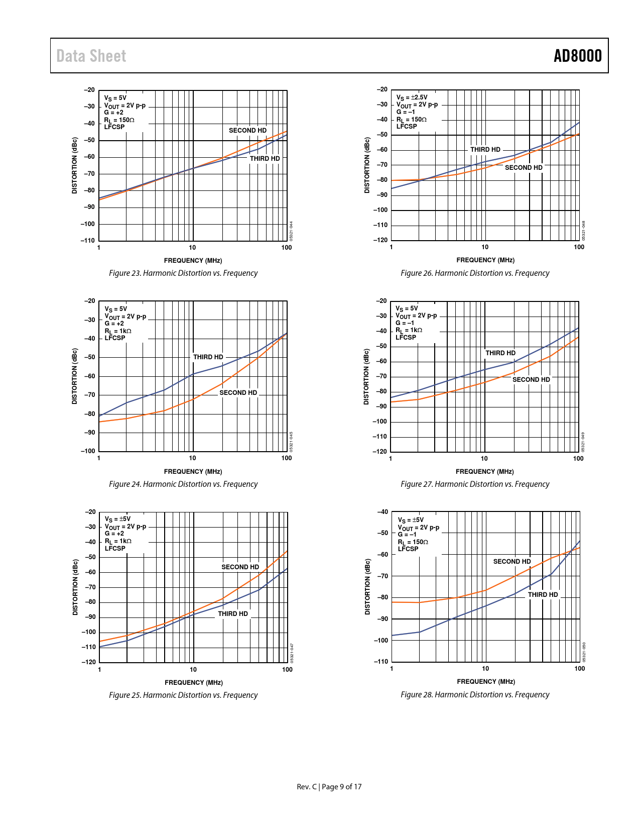 Data Sheet. AD8000. –20. S = 5V. S =. 2.5V. –30. OUT = 2V p-p. G = +2. G = –1. –40. L = 150. LFCSP. SECOND HD. –50. Bc). –60. THIRD HD. –70. –80. DISTORTION (