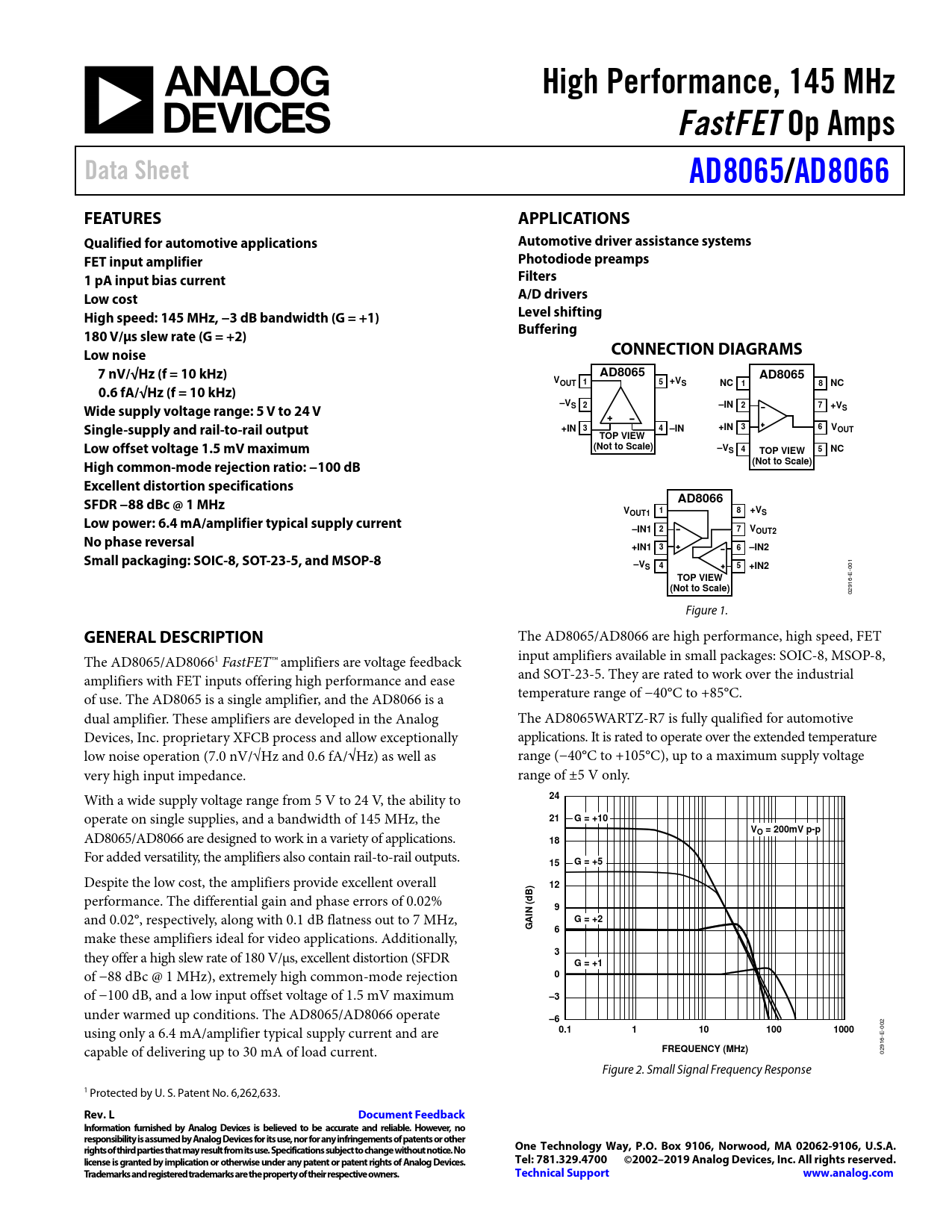 High Performance, 145 MHz. FastFET. Op Amps. Data Sheet. AD8065/. AD8066. FEATURES. APPLICATIONS. Qualified for automotive applications