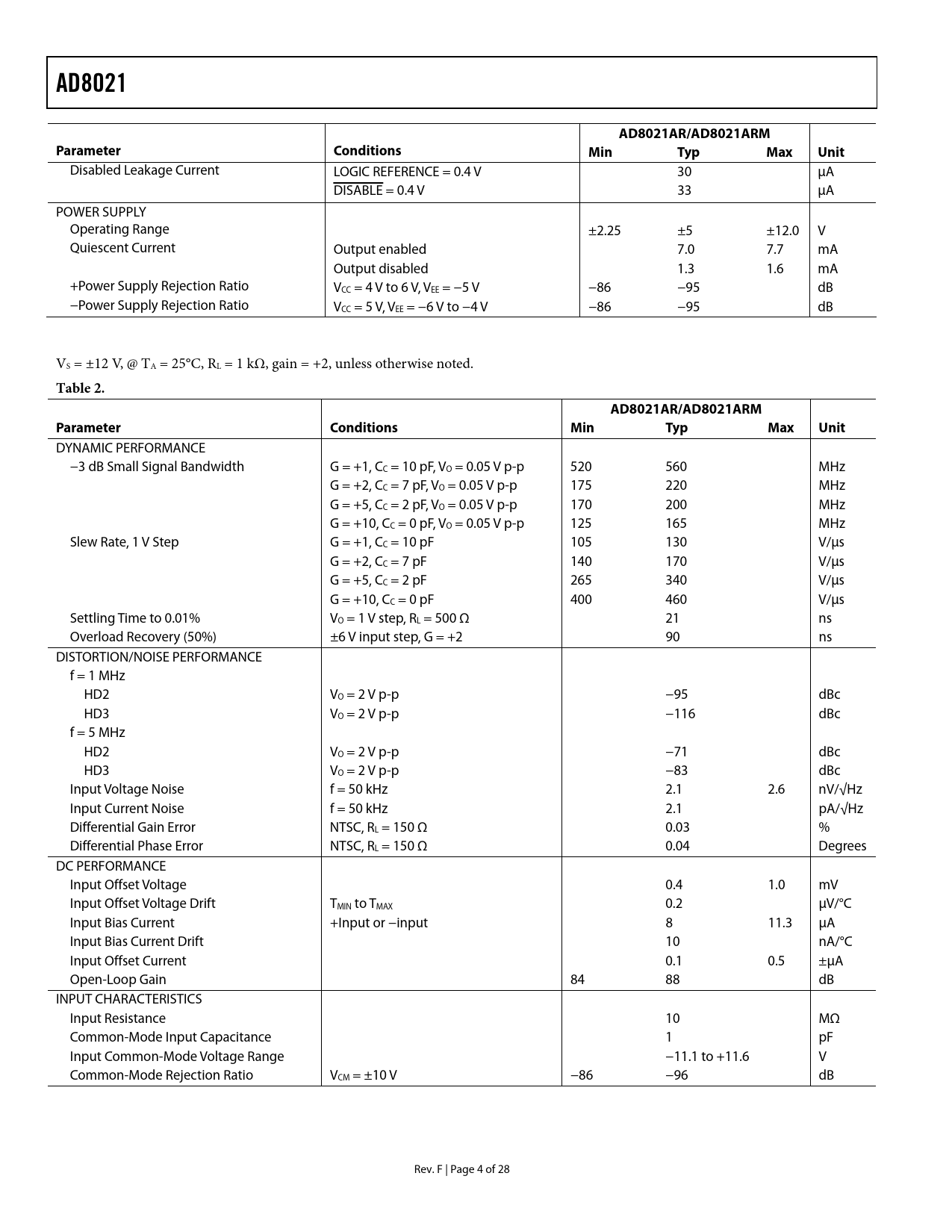 AD8021AD8021AR/AD8021ARMParameter ConditionsMinTypMaxUnit Disabled Leakage Current LOGIC REFERENCE = 0.4 V 30 μA DISABLE = 0.4 V 33 μA POWER SUPPLY Operating Range ±2.25 ±5 ±12.0 V Quiescent Current Output enabled 7.0 7.7 mA Output disabled 1.3 1.6 mA +Power Supply Rejection Ratio VCC = 4 V to 6 V, VEE = −5 V −86 −95 dB −Power Supply Rejection Ratio VCC = 5 V, VEE = −6 V to −4 V −86 −95 dB VS = ±12 V, @ TA = 25°C, RL = 1 kΩ, gain = +2, unless otherwise noted. Table 2. AD8021AR/AD8021ARMParameter ConditionsMinTypMaxUnit DYNAMIC PERFORMANCE −3 dB Small Signal Bandwidth G = +1, CC = 10 pF, VO = 0.05 V p-p 520 560 MHz G = +2, CC = 7 pF, VO = 0.05 V p-p 175 220 MHz G = +5, CC = 2 pF, VO = 0.05 V p-p 170 200 MHz G = +10, CC = 0 pF, VO = 0.05 V p-p 125 165 MHz Slew Rate, 1 V Step G = +1, CC = 10 pF 105 130 V/μs G = +2, CC = 7 pF 140 170 V/μs G = +5, CC = 2 pF 265 340 V/μs G = +10, CC = 0 pF 400 460 V/μs Settling Time to 0.01% VO = 1 V step, RL = 500 Ω 21 ns Overload Recovery (50%) ±6 V input step, G = +2 90 ns DISTORTION/NOISE PERFORMANCE f = 1 MHz HD2 VO = 2 V p-p −95 dBc HD3 VO = 2 V p-p −116 dBc f = 5 MHz HD2 VO = 2 V p-p −71 dBc HD3 VO = 2 V p-p −83 dBc Input Voltage Noise f = 50 kHz 2.1 2.6 nV/√Hz Input Current Noise f = 50 kHz 2.1 pA/√Hz Differential Gain Error NTSC, RL = 150 Ω 0.03 % Differential Phase Error NTSC, RL = 150 Ω 0.04 Degrees DC PERFORMANCE Input Offset Voltage 0.4 1.0 mV Input Offset Voltage Drift TMIN to TMAX 0.2 μV/°C Input Bias Current +Input or −input 8 11.3 μA Input Bias Current Drift 10 nA/°C Input Offset Current 0.1 0.5 ±μA Open-Loop Gain 84 88 dB INPUT CHARACTERISTICS Input Resistance 10 MΩ Common-Mode Input Capacitance 1 pF Input Common-Mode Voltage Range −11.1 to +11.6 V Common-Mode Rejection Ratio VCM = ±10 V −86 −96 dB Rev. F | Page 4 of 28 Document Outline FEATURES APPLICATIONS GENERAL DESCRIPTION CONNECTION DIAGRAM TABLE OF CONTENTS REVISION HISTORY SPECIFICATIONS ABSOLUTE MAXIMUM RATINGS MAXIMUM POWER DISSIPATION ESD CAUTION PIN CONFIGURATION AND FUNCTION DESCRIPTIONS TYPICAL PERFORMANCE CHARACTERISTICS TEST CIRCUITS APPLICATIONS USING THE DISABLE FEATURE THEORY OF OPERATION PCB LAYOUT CONSIDERATIONS DRIVING 16-BIT ADCs DIFFERENTIAL DRIVER USING THE AD8021 IN ACTIVE FILTERS DRIVING CAPACITIVE LOADS OUTLINE DIMENSIONS ORDERING GUIDE