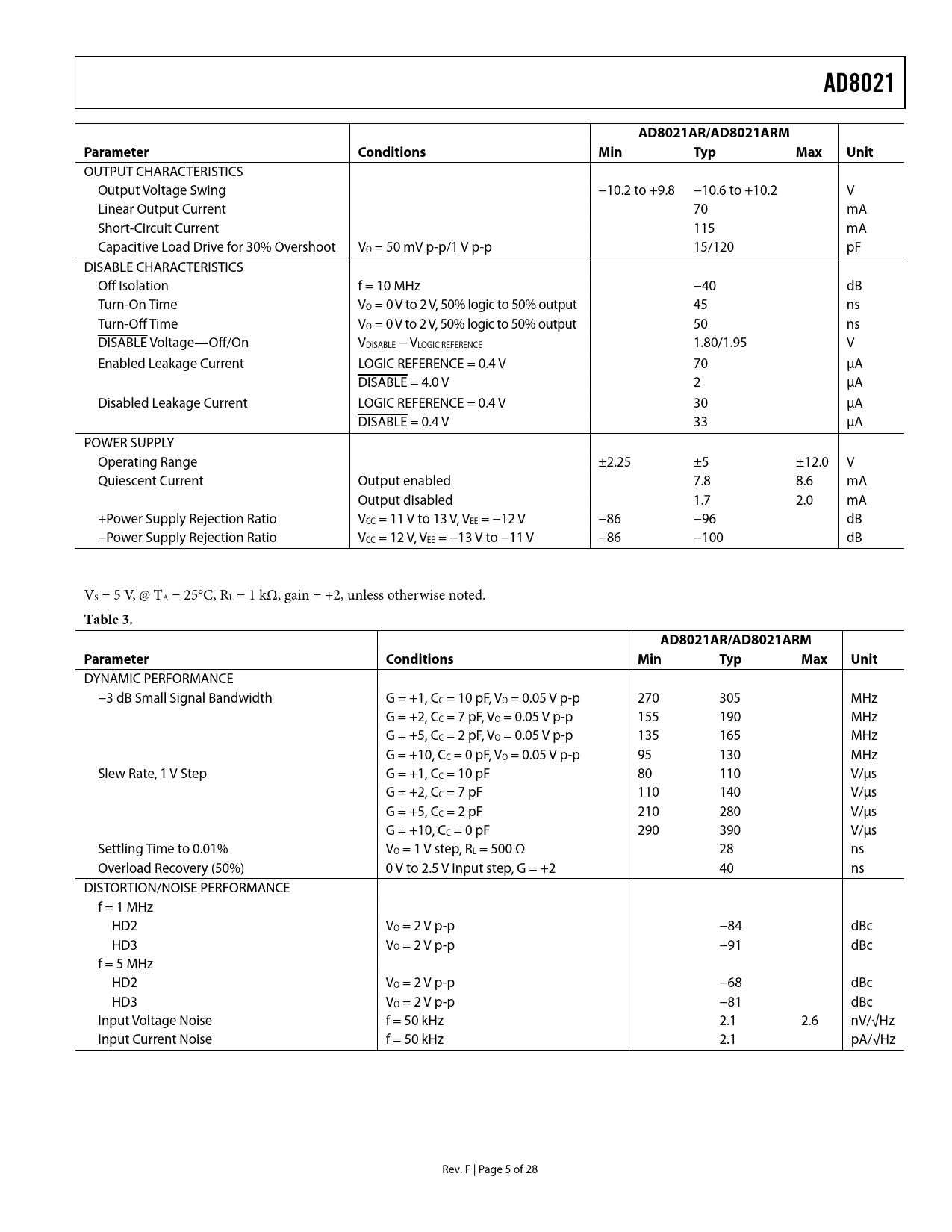 AD8021 AD8021AR/AD8021ARM Parameter Conditions Min Typ Max Unit Table 3 Parameter Conditions