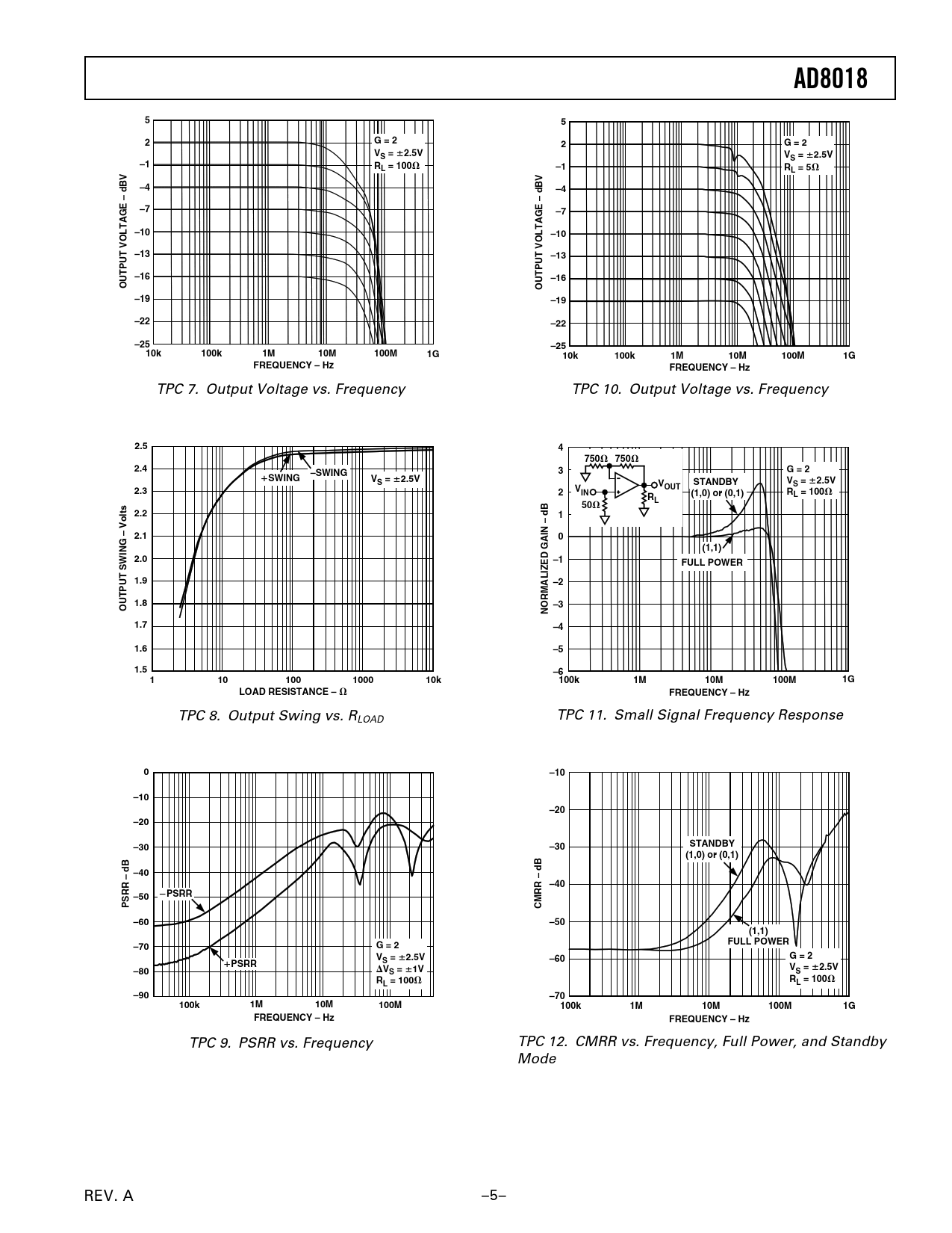 TPC 9. PSRR vs. Frequency TPC 12. CMRR vs. Frequency, Full Power, and Standby Mode REV. A –5–