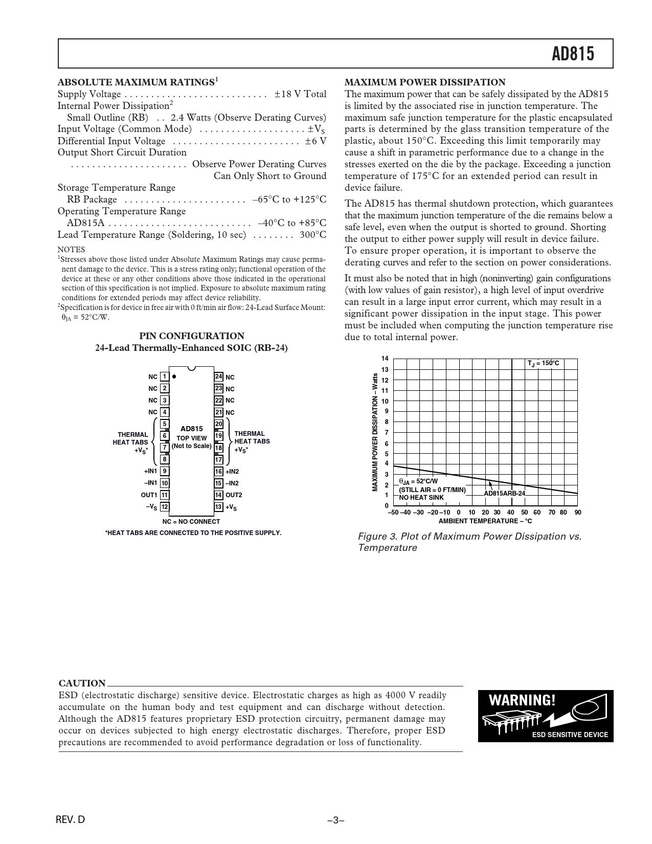 AD815. ABSOLUTE MAXIMUM RATINGS1. MAXIMUM POWER DISSIPATION. PIN CONFIGURATION. 24-Lead Thermally-Enhanced SOIC (RB-24). TJ = 150