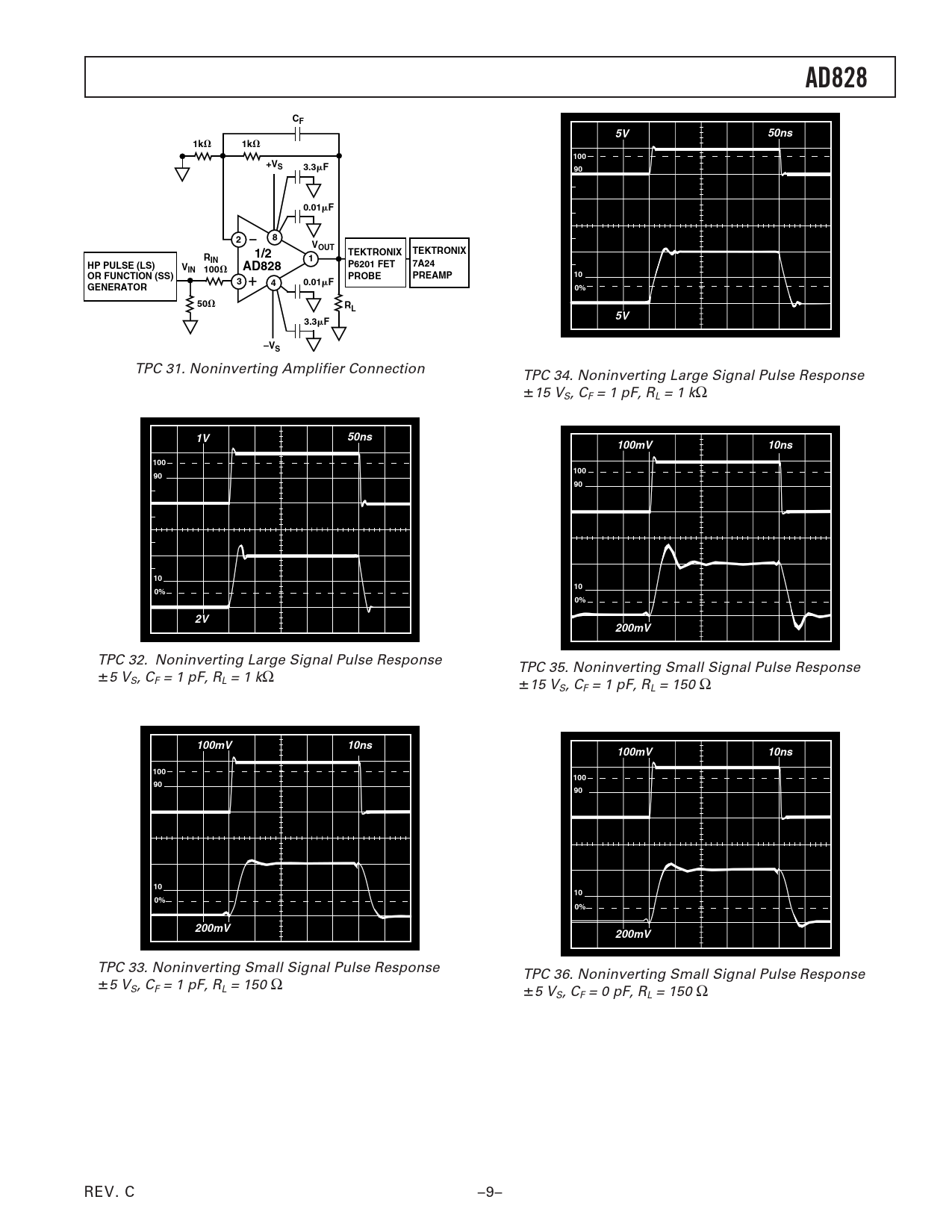 | Páginas / Página | 12 / 9 — AD828. 50ns. 100. +VS. 3.3. 0.01. VOUT. TEKTRONIX. 1/2. RIN. HP PULSE … |