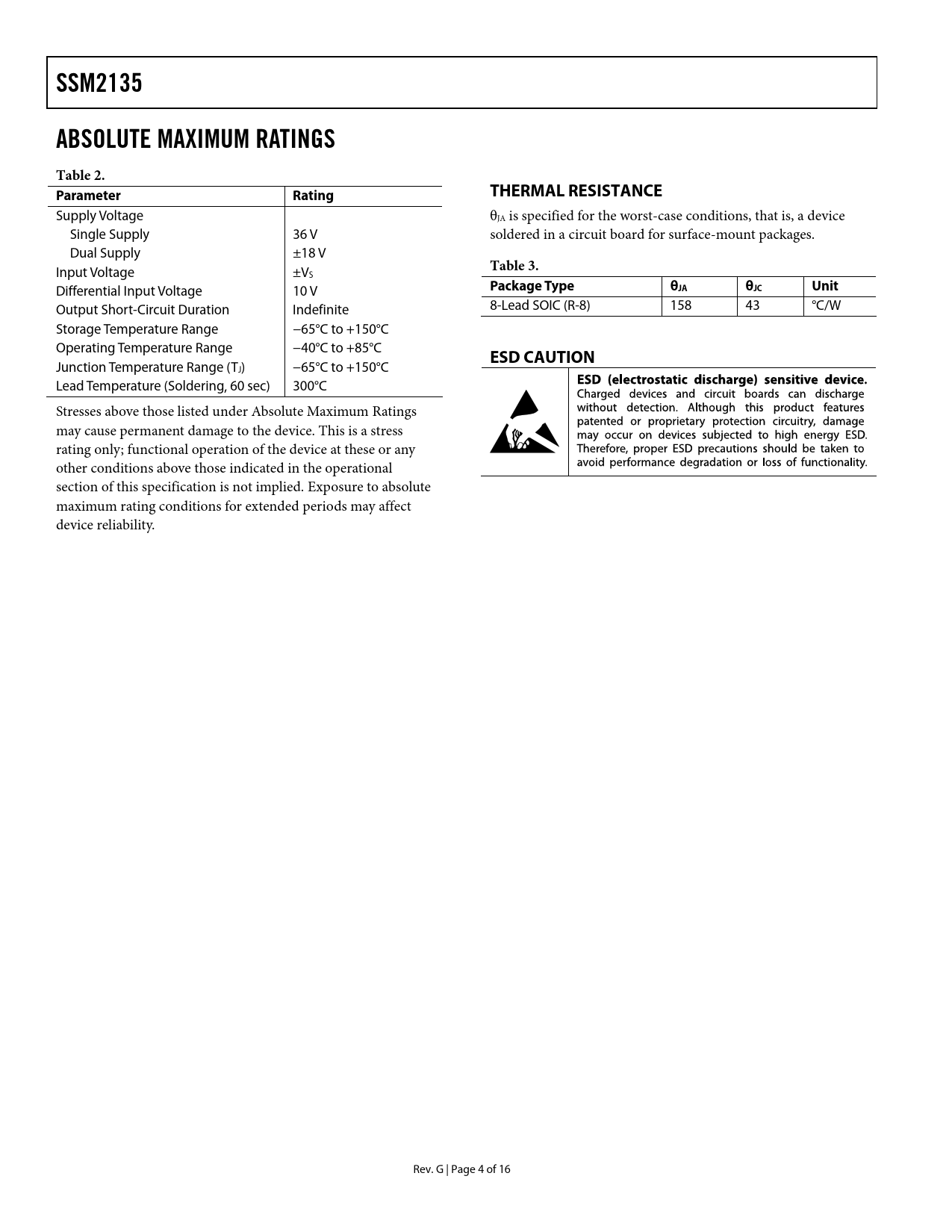 SSM2135. ABSOLUTE MAXIMUM RATINGS. Table 2. Parameter Rating. THERMAL RESISTANCE. Table 3. Package Type. θJA. θJC Unit. ESD CAUTION