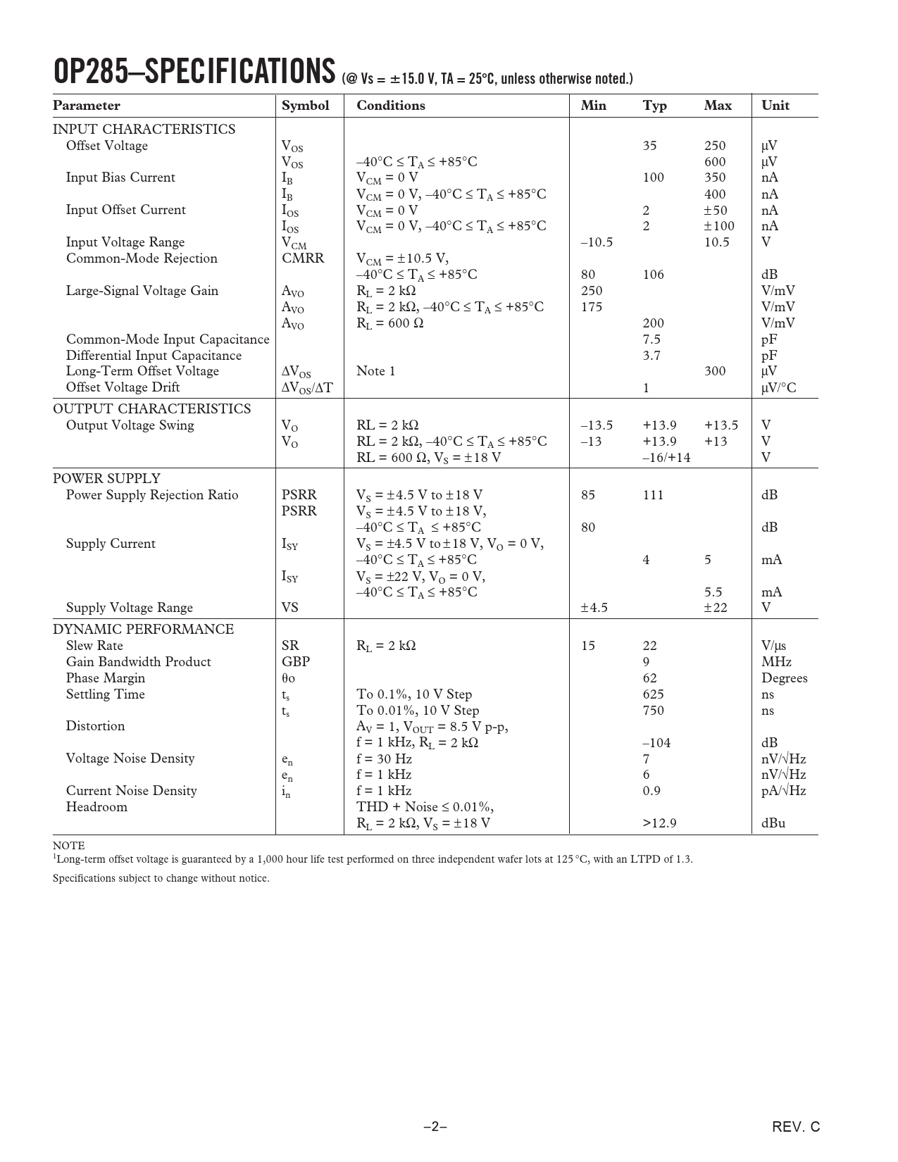 OP285–SPECIFICATIONS (@ Vs =15.0 V, TA = 25C, unless otherwise noted.) ParameterSymbolConditionsMinTypMaxUnit INPUT CHARACTERISTICS Offset Voltage VOS 35 250 µV VOS –40°C ≤ TA ≤ +85°C 600 µV Input Bias Current IB VCM = 0 V 100 350 nA IB VCM = 0 V, –40°C ≤ TA ≤ +85°C 400 nA Input Offset Current IOS VCM = 0 V 2 ±50 nA IOS VCM = 0 V, –40°C ≤ TA ≤ +85°C 2 ±100 nA Input Voltage Range VCM –10.5 10.5 V Common-Mode Rejection CMRR VCM = ± 10.5 V, –40°C ≤ TA ≤ +85°C 80 106 dB Large-Signal Voltage Gain AVO RL = 2 kΩ 250 V/mV AVO RL = 2 kΩ, –40°C ≤ TA ≤ +85°C 175 V/mV AVO RL = 600 Ω 200 V/mV Common-Mode Input Capacitance 7.5 pF Differential Input Capacitance 3.7 pF Long-Term Offset Voltage ∆VOS Note 1 300 µV Offset Voltage Drift ∆VOS/∆T 1 µV/°C OUTPUT CHARACTERISTICS Output Voltage Swing VO RL = 2 kΩ –13.5 +13.9 +13.5 V VO RL = 2 kΩ, –40°C ≤ TA ≤ +85°C –13 +13.9 +13 V RL = 600 Ω, VS = ± 18 V –16/+14 V POWER SUPPLY Power Supply Rejection Ratio PSRR VS = ± 4.5 V to ± 18 V 85 111 dB PSRR VS = ± 4.5 V to ± 18 V, –40°C ≤ TA ≤ +85°C 80 dB Supply Current ISY VS = ±4.5 V to ± 18 V, VO = 0 V, –40°C ≤ T 4 5 mA A ≤ +85°C ISY VS = ±22 V, VO = 0 V, –40°C ≤ TA ≤ +85°C 5.5 mA Supply Voltage Range VS ±4.5 ±22 V DYNAMIC PERFORMANCE Slew Rate SR RL = 2 kΩ 15 22 V/µs Gain Bandwidth Product GBP 9 MHz Phase Margin o 62 Degrees Settling Time ts To 0.1%, 10 V Step 625 ns ts To 0.01%, 10 V Step 750 ns Distortion AV = 1, VOUT = 8.5 V p-p, f = 1 kHz, RL = 2 kΩ –104 dB Voltage Noise Density en f = 30 Hz 7 nV/√Hz en f = 1 kHz 6 nV/√Hz Current Noise Density in f = 1 kHz 0.9 pA/√Hz Headroom THD + Noise ≤ 0.01%, RL = 2 kΩ, VS = ± 18 V >12.9 dBu NOTE 1Long-term offset voltage is guaranteed by a 1,000 hour life test performed on three independent wafer lots at 125 °C, with an LTPD of 1.3. Specifications subject to change without notice. –2– REV. C