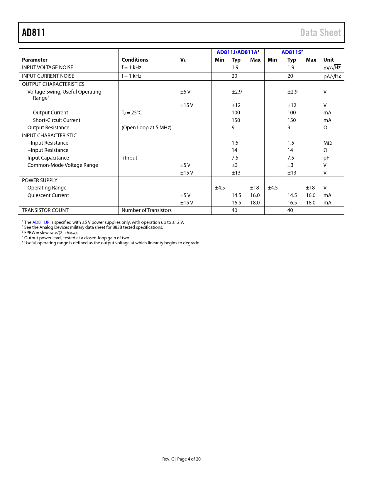 Páginas / Página20 / 4 — AD811. Data Sheet. AD811J/AD811A1. AD811S2. Parameter. Conditions. Min …