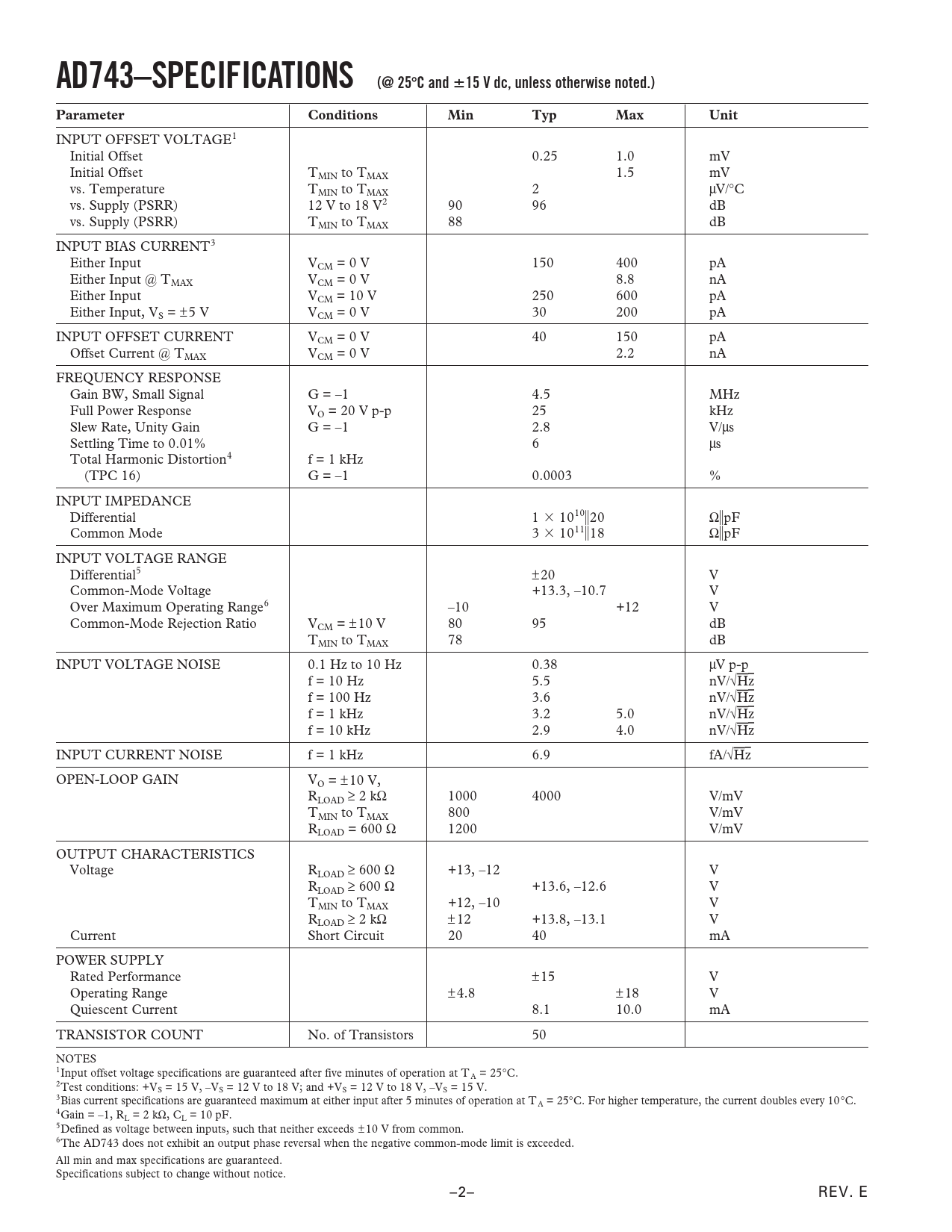 AD743–SPECIFICATIONS (@ 25 C and 15 V dc, unless otherwise noted.) Parameter Conditions Min Typ Max Unit