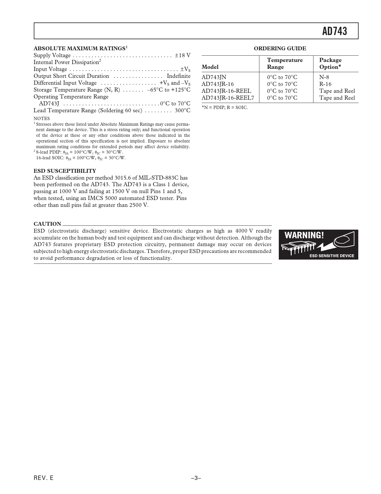 AD743ABSOLUTE MAXIMUM RATINGS1ORDERING GUIDE Supply Voltage . ± 18 V Internal Power Dissipation2 TemperaturePackage Input Voltage . ± V ModelRangeOption* S Output Short Circuit Duration . Indefinite AD743JN 0°C to 70°C N-8 Differential Input Voltage . +VS and –VS AD743JR-16 0°C to 70°C R-16 Storage Temperature Range (N, R) . –65°C to +125°C AD743JR-16-REEL 0°C to 70°C Tape and Reel Operating Temperature Range AD743JR-16-REEL7 0°C to 70°C Tape and Reel AD743J . 0°C to 70°C *N = PDIP; R = SOIC. Lead Temperature Range (Soldering 60 sec) . 300°C NOTES 1 Stresses above those listed under Absolute Maximum Ratings may cause perma- nent damage to the device. This is a stress rating only; and functional operation of the device at these or any other conditions above those indicated in the operational section of this specification is not implied. Exposure to absolute maximum rating conditions for extended periods may affect device reliability. 2 8-lead PDIP: JA = 100°C/W, JC = 30°C/W. 16-lead SOIC: JA = 100°C/W, JC = 30°C/W. ESD SUSCEPTIBILITY An ESD classification per method 3015.6 of MIL-STD-883C has been performed on the AD743. The AD743 is a Class 1 device, passing at 1000 V and failing at 1500 V on null Pins 1 and 5, when tested, using an IMCS 5000 automated ESD tester. Pins other than null pins fail at greater than 2500 V. CAUTION ESD (electrostatic discharge) sensitive device. Electrostatic charges as high as 4000 V readily accumulate on the human body and test equipment and can discharge without detection. Although the AD743 features proprietary ESD protection circuitry, permanent damage may occur on devices subjected to high energy electrostatic discharges. Therefore, proper ESD precautions are recommended to avoid performance degradation or loss of functionality. REV. E –3– Document Outline FEATURES APPLICATIONS GENERAL DESCRIPTION PRODUCT HIGHLIGHTS CONNECTION DIAGRAMS SPECIFICATIONS ABSOLUTE MAXIMUM RATINGS ESD SUSCEPTIBILITY ORDERING GUIDE Typical Performance Characteristics OP AMP PERFORMANCE: JFET VS. BIPOLAR DESIGNING CIRCUITS FOR LOW NOISE LOW NOISE CHARGE AMPLIFIERS HOW CHIP PACKAGE TYPE AND POWER DISSIPATION AFFECT INPUT BIAS CURRENT REDUCED POWER SUPPLY OPERATION FOR LOWER IB AN INPUT IMPEDANCE COMPENSATED, SALLEN-KEY FILTER TWO HIGH PERFORMANCE ACCELEROMETER AMPLIFIERS LOW NOISE HYDROPHONE AMPLIFIER BALANCING SOURCE IMPEDANCES OUTLINE DIMENSIONS Revision History