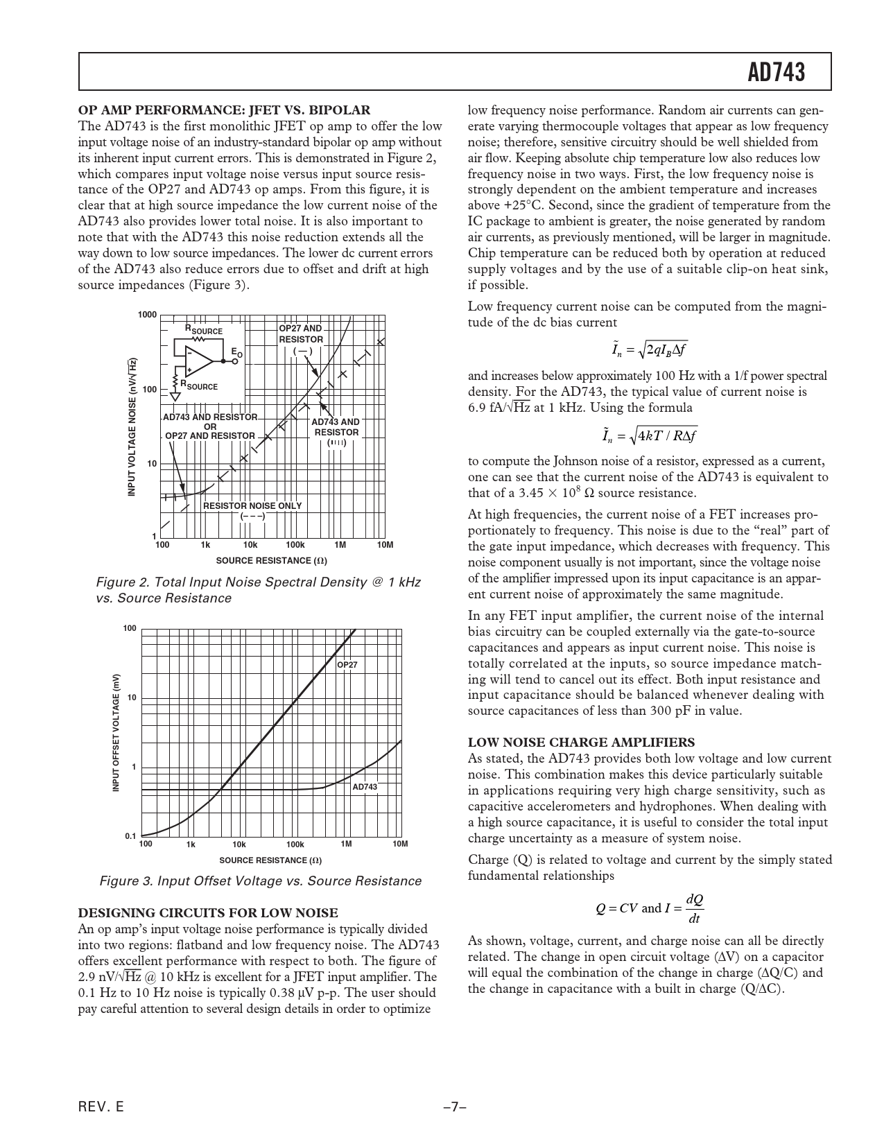 AD743. OP AMP PERFORMANCE: JFET VS. BIPOLAR. 1000. OP27 AND. SOURCE. RESISTOR. ( — ). z) H /. 100. (nV. E IS. AD743 AND RESISTOR. AD743 AND