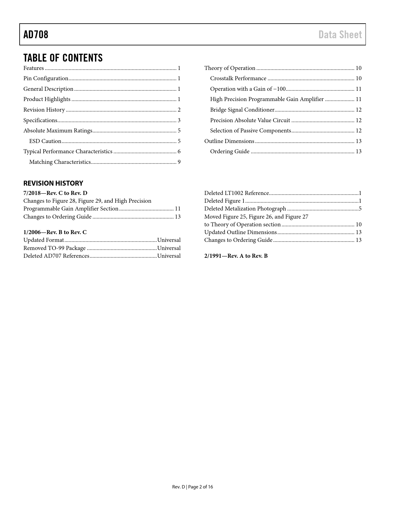 AD708 Data Sheet TABLE OF CONTENTS REVISION HISTORY 7/2018—Rev C to Rev D 1/2006—Rev B to Rev C 2/1991—Rev A to Rev B