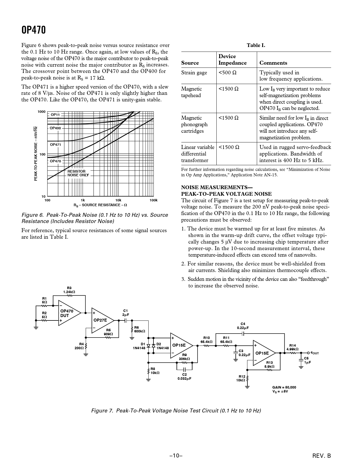 OP470. Table I. Device. Source. Impedance. Comments. 1000. OP11. OP400. OP471. 100. O-PEAK NOISE – nV/ Hz. RESISTOR. NOISE ONLY. PEAK-T