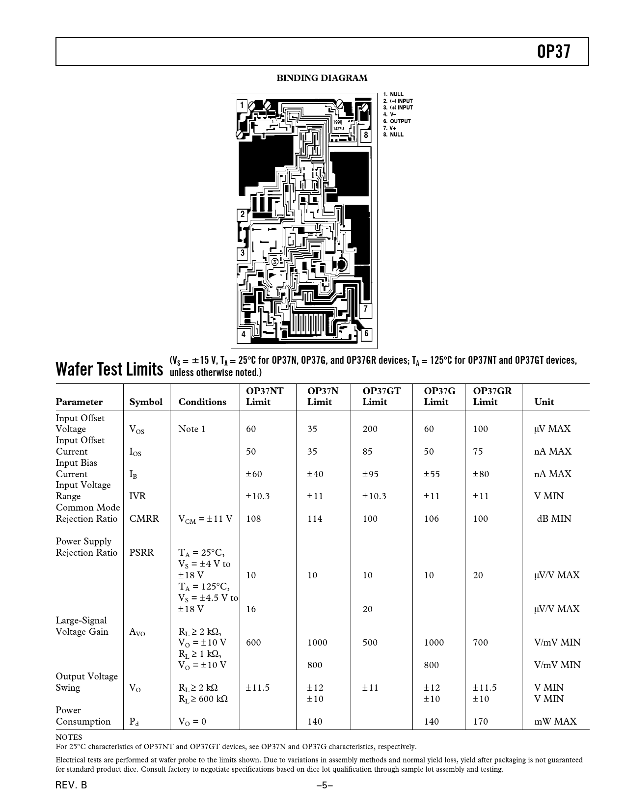 OP37 BINDING DIAGRAM 1. NULL 2. (–) INPUT 1 3. (+) INPUT 4. V– 1990 6. OUTPUT 1427U 7. V+ 8 8. NULL 2 3 7 4 6 (V Wafer Test Limits S = 15 V, TA = 25 C for OP37N, OP37G, and OP37GR devices; TA = 125 C for OP37NT and OP37GT devices, unless otherwise noted.) OP37NT OP37N OP37GT OP37G OP37GR Parameter Symbol Conditions Limit Limit Limit Limit Limit Unit