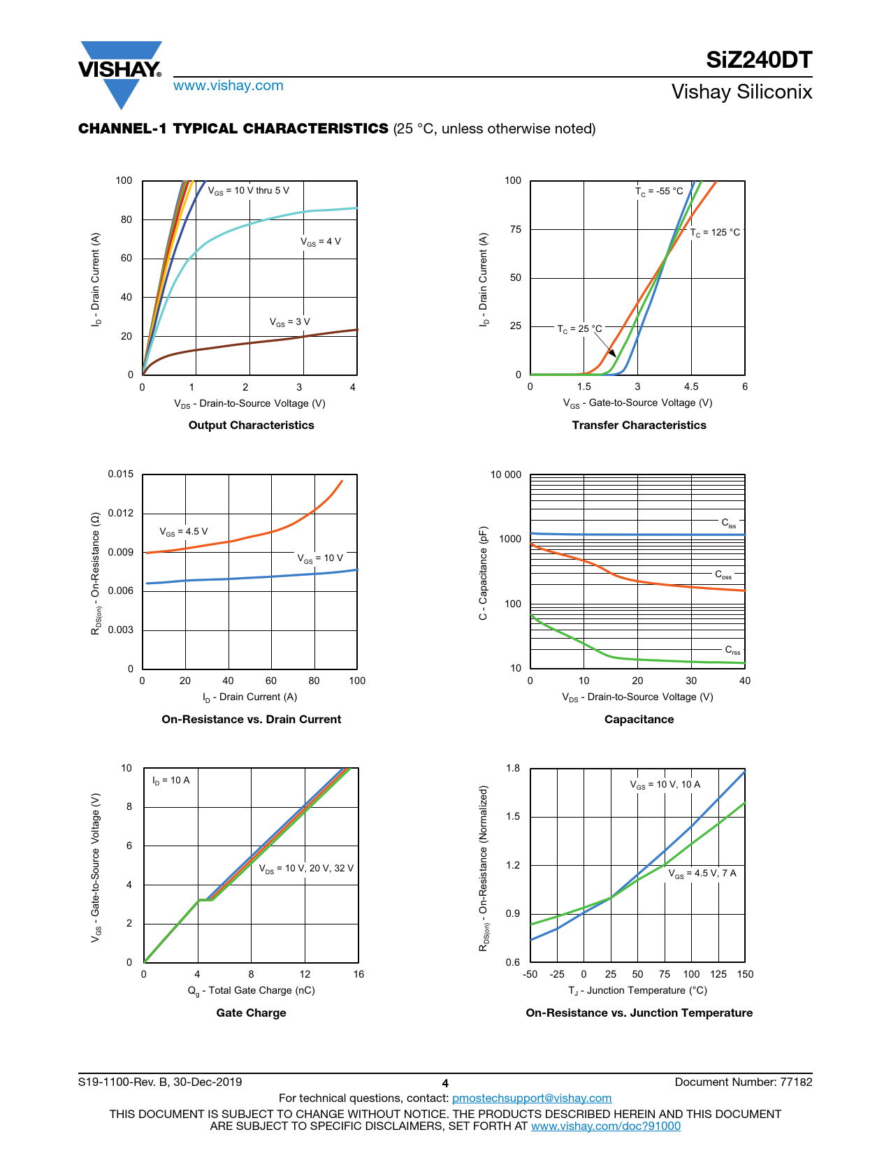 SiZ240DT. CHANNEL-1 TYPICAL CHARACTERISTICS. Output Characteristics. Transfer Characteristics. On-Resistance vs. Drain Current