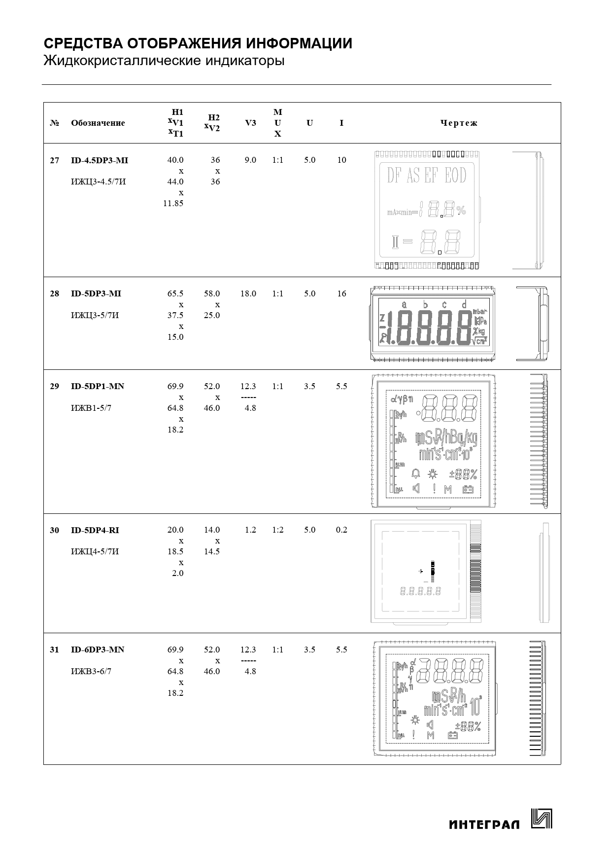 СРЕДСТВА ОТОБРАЖЕНИЯ ИНФОРМАЦИИ № Обозначение xV1 U I Ч е р т е ж 27 ID-4.5DP3-MI 28 ID-5DP3-MI 29 ID-5DP1-MN 30 ID-5DP4-RI