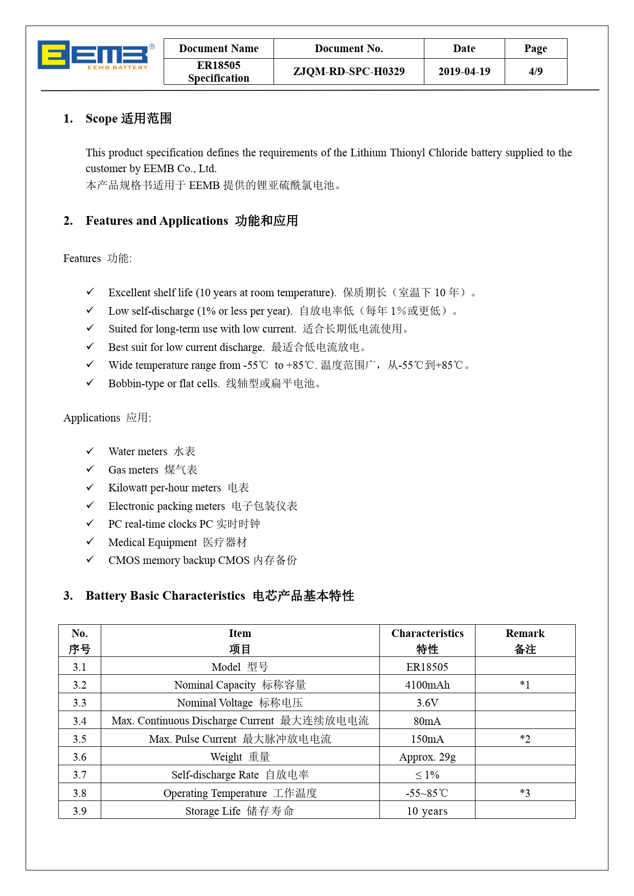 适用范围 This product specification defines the requirements of the Lithium Thionyl Chloride battery supplied to the customer by EEMB Co., Ltd. 本产品规格书适用于 EEMB 提供的锂亚硫酰氯电池。